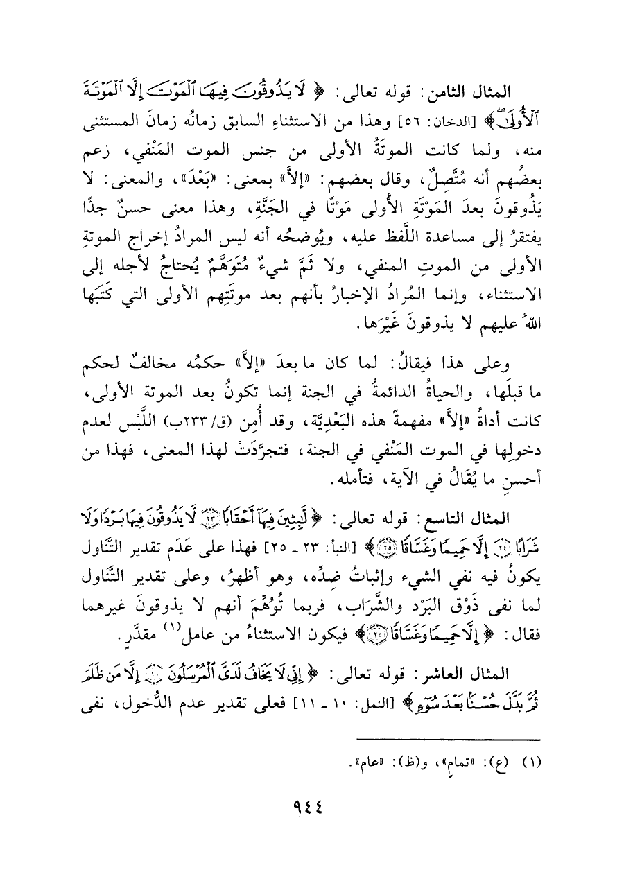 المثال الثامن: قوله تعالى: {لَا يَذُوقُونَ فِيهَا الْمَوْتَ إِلَّا الْمَوْتَةَ الْأُولَى} [الدخان: ٥٦] وهذا من الاستثناءِ السابق زمانُه زمان المستثنى منه، ولمّا كانت الموتَةُ الأولى من جنس الموت المنفي، زعم بعضُهم أنه مُتَّصِلٌ، وقال بعضهم: "إلَاّ" بمعنى: "بَعْدَ"، والمعنى: لا يَذُوقون بعدَ المَوْتَةِ الأولى مَوْتًا في الجَنَّةِ، وهذا معنى حسنٌ جدًّا يفتقرُ إلى مساعدة اللَّفظ عليه، ويُوضحُه أنه ليس المرادُ إخراج الموتةِ الأولى من الموتِ المنفي، ولا ثَمَّ شيءٌ مُتَوَهَّمٌ يُحتاجُ لأجله إلى الاستثناء، وإنما المُراد الإخبار بأنهم بعد موتَتِهم الأولى التي كَتبَها الله عليهم لا يذوقون غيْرَها.