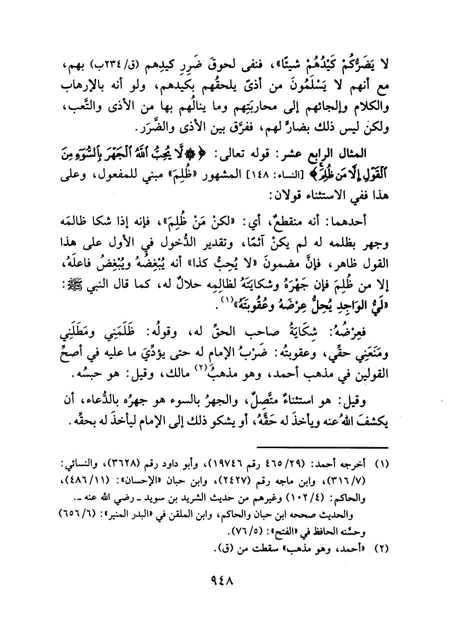 أحدهما: أنه منقطعٌ، أي: "لكنْ مَنْ ظُلِمَ "، فإنه إذا شكا ظالمه وجهر بظلمه له لم يكنْ آثمًا، وتقدير الدُّخول في الأول على هذا القول ظاهر، فإنَّ مضمونَ "لا يُحِبُّ كذا" أنه يُبْغِضُهُ ويُبْغِضُ فاعلهُ، إلا من ظُلِمَ فإن جَهْرَهُ وشكايتهُ لظالمه حلالٌ له، كما قال النبي - صلى الله عليه وسلم -: "ليُّ الوَاجِدِ يُحِلُّ عِرْضَهُ وعُقوبتهُ" (¬١).
