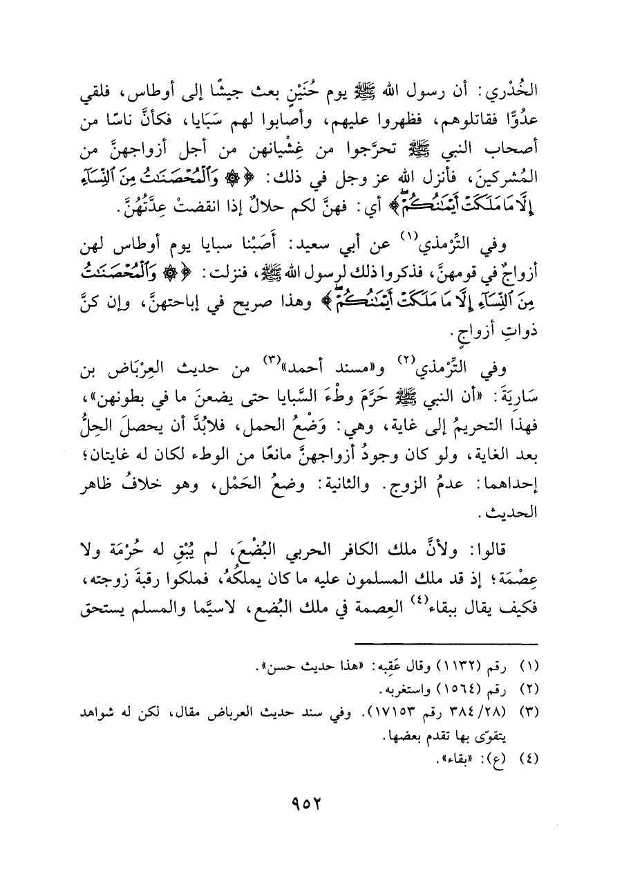 وفي التِّرمْذي (¬١) عن أبي سعيد: أَصَبْنا سبايا يوم أوطاس لهن أزواجٌ في قومهنَّ، فذكروا ذلك لرسول الله - صلى الله عليه وسلم - , فنزلت: {وَالْمُحْصَنَاتُ مِنَ النِّسَاءِ إِلَّا مَا مَلَكَتْ أَيْمَانُكُمْ} وهذا صريح في إباحتهنَّ، وإن كنَّ ذواتِ أزواجٍ.