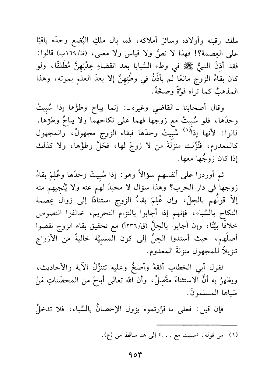 ثم أوردوا على أنفسهم سؤالاً وهو: إذا سُبيتْ وحدَها وعُلِمَ بقاءُ زوجها فى دار الحرب؛ وهذا سؤال لا محيدَ لهَم عنه ولا يُنجيهم منه إلاّ قولُهم بالحِلّ، وإن عُلِمَ بقاء الزوج استنادًا إلى زوال عِصمة النكاح بالسِّباء، فإنهم إذا أجابوا بالتزام التحريم، خالفوا النصوص خلافًا بيِّنًا، وإن أجابوا بالحِل مع تحقيق بقاء الزوج نقضوا أصلَهم، حيث أسندوا الحِلَّ إلى كون المسبِية خالية من الأزواج تنزيلاً للمجهول منزلةَ المعدوم.