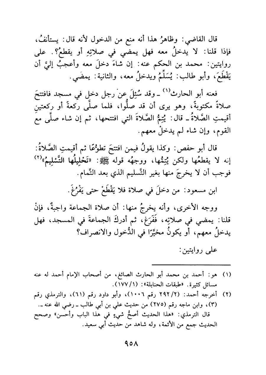 قال القاضي: وظاهرُ هذا أنه منع من الدخول لأنه قال: يستأنفُ، فإذا قلنا: لا يدخل معه فهل يمضي في صلاتِهِ أو يقطعُ؟. على روايتين: محمد بن الحكم عنه: إن شاءَ دخلَ معه وأعجبُ إليَّ أن يَقْطَعَ، وأبو طالب: يُسَلَّمُ ويدخل معه، والثانية: يمضي.