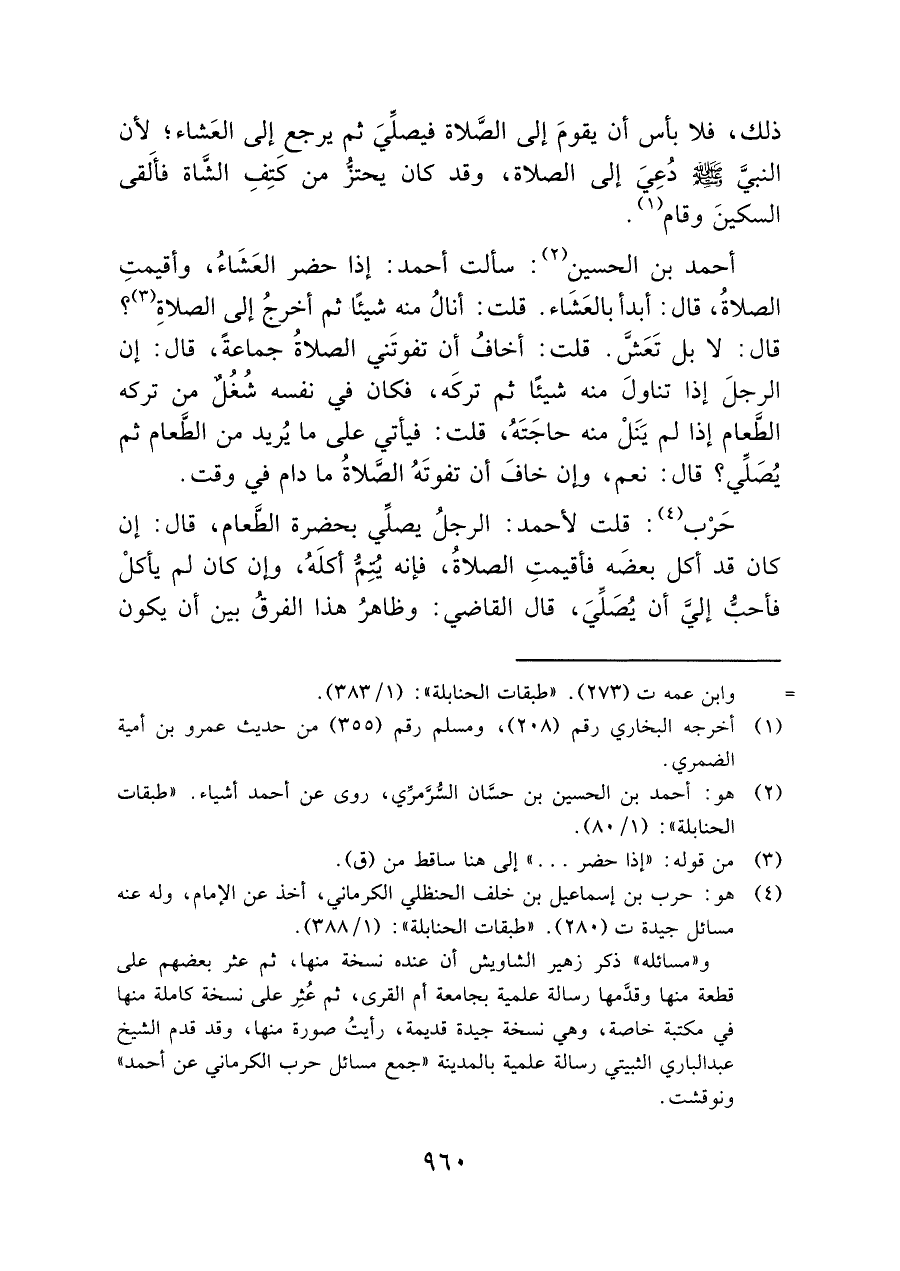 أحمد بن الحسين (¬٢): سألت أحمد: إذا حضر العَشَاءُ، وأقيمتِ الصلاةُ، قال: ابدأ بالعَشَاء. قلت: أنالُ منه شيئًا ثم أخرجُ إلى الصَّلاةِ (¬٣)؛ قال: لا بل تَعَشَّ. قلت: أخافُ أن تفوتَني الصلاةُ جماعةً، قال: إن الرجلَ إذا تناولَ منه شيئًا ثم تركَه، فكان في نفسه شُغُلٌ من ترْكه الطَّعام إذا لم ينَلْ منه حاجَتَهُ، قلت: فيأتي على ما يُريد من الطعام ثم يُصَلِّي؛ قال: نعم، وإن خاف أن تفوتَه الصَّلاة ما دام في وقت.