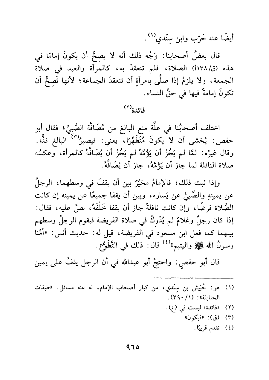 اختلف أصحابنا في علَّة منع البالغ من مصَافَّة الصَّبيِّ؛ فقال أبو حفص: يُخشى أن لا يكونَ مُتَطَهرًا، يعني: فيصيرُ (¬٣) البالغ فذًّا. وقال غيرُه: لمَّا لم يَجُزْ أن يَؤُمَّهُ لم يَجُزْ أن يُصَافَّهُ كالمرأة، وعكسُه صلاة النافلة لما جاز أن يَؤمَّهُ, جاز أن يُصَافَّهُ.