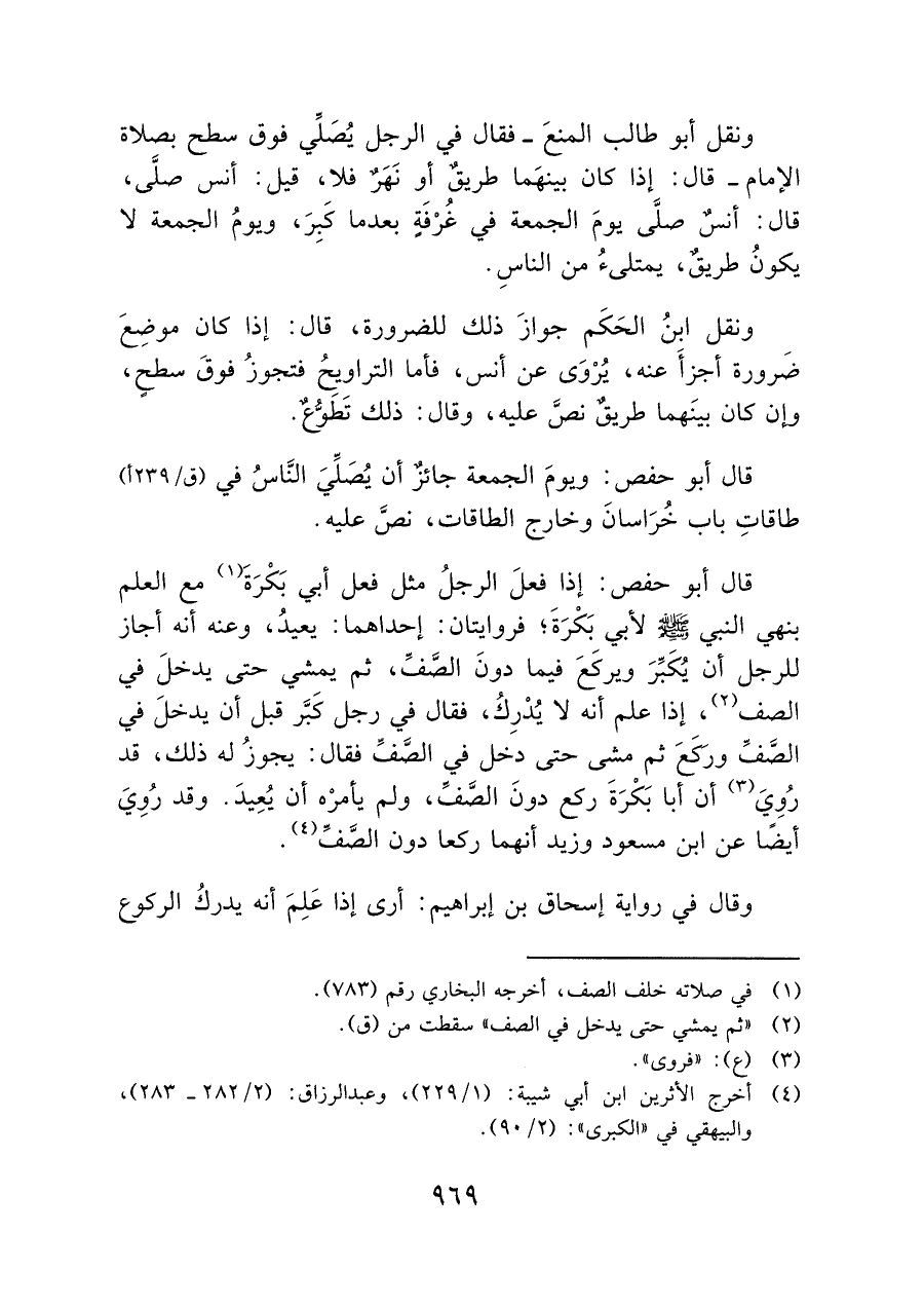 قال أبو حفص: إذا فعلَ الرجل مثل فعل أبي بَكْرَةَ (¬١) مع العلم بنهي النبي - صلى الله عليه وسلم - لأبي بَكْرَةَ، فروايتان: إحداهما: يعيدُ، وعنه أنه أجاز للرجل أن يُكَبِّرَ ويركَعَ فيما دونَ الصَّفِّ، ثم يمشي حتى يدخلَ في الصف (¬٢)، إذا علم أنه لا يُدْرِكُ، فقال في رجل كَبَّر قبل أن يدخلَ في الصَّفِّ وركَعَ ثم مشى حتى دخل في الصَّفِّ فقال: يجوز له ذلك، قد رُوِيَ (¬٣) أن أبا بَكْرَةَ ركع دونَ الصَّفِّ، ولم يأمرْه أن يُعِيدَ. وقد رُوِيَ أيضًا عن ابن مسعود وزيد أنهما ركعا دون الصَّفِّ (¬٤).