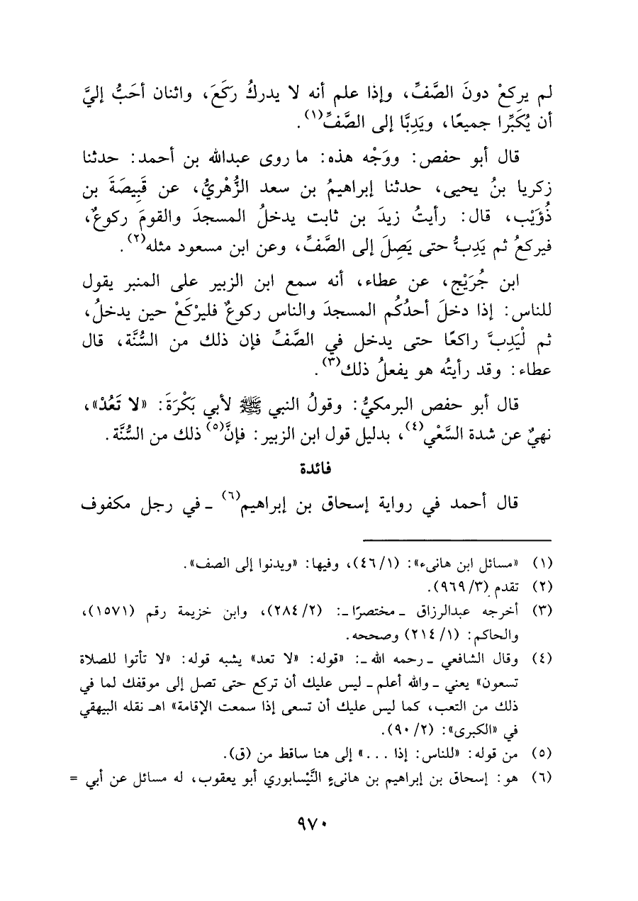 قال أبو حفص: ووَجْه هذه: ما روى عبد الله بن أحمد: حدثنا زكريا بنُ يحيى، حدثنا إبراهيمُ بن سعد الزُّهْرىُّ، عن قَبيصَةَ بن ذُؤَيْب، قال: رأيتُ زيدَ بن ثابت يدخلُ المسجدَ والقوم ركوعٌ فيركعُ ثم يَدِبُّ حتى يَصلَ إلى الصَّفِّ، وعن ابن مسعود مثله (¬٢).