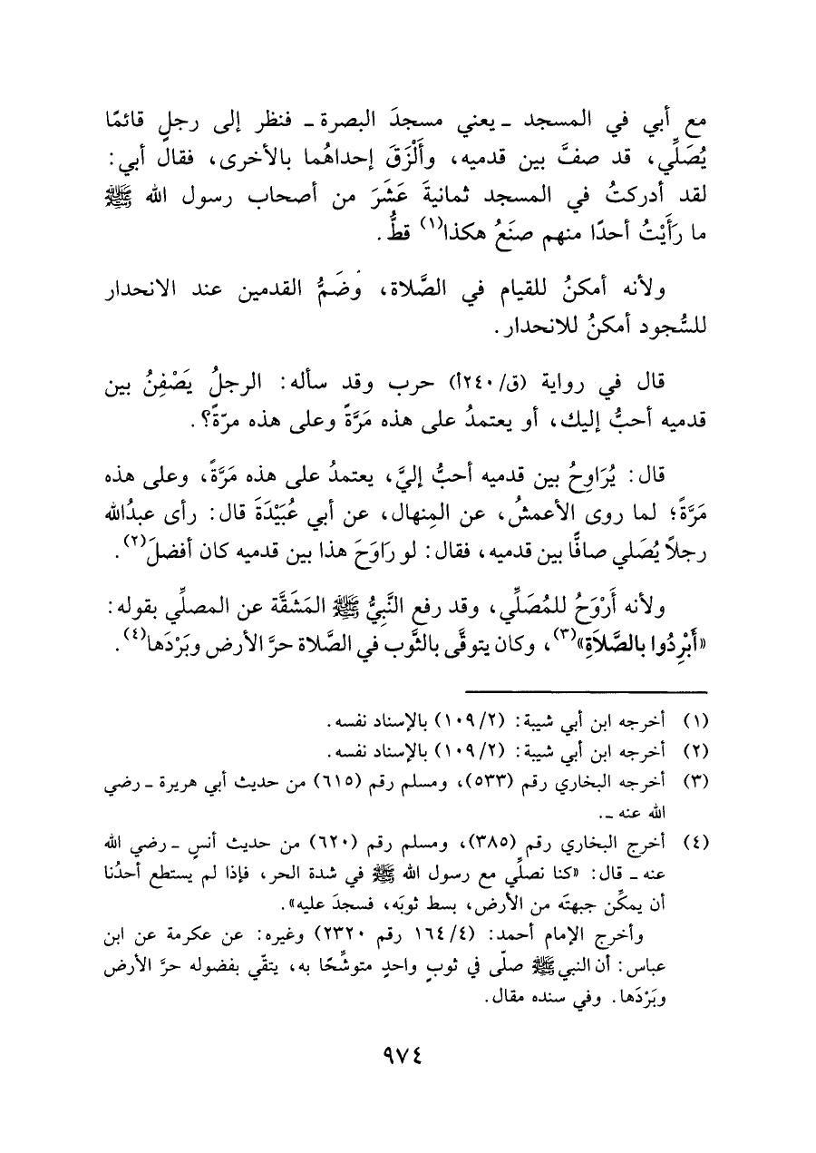 قال في رواية (ق/ ٢٤٠ أ) حرب وقد سأله: الرجلُ يصُفَّنَّ بين قدميه أحبُّ إليك، أو يعتمدُ على هذه مَرَّةً وعلى هذه مرّةً؟.