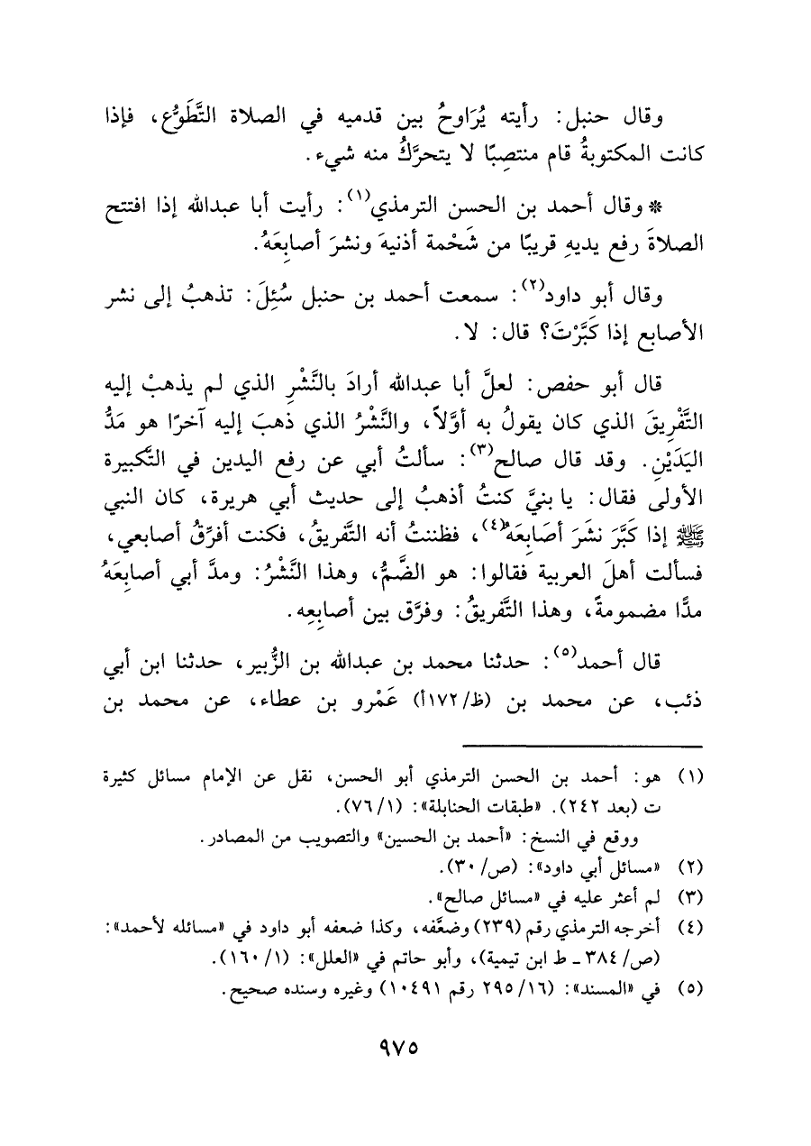 قال أبو حفص: لعلَّ أبا عبد الله أرادَ بالنَّشْرِ الذي لم يذهبْ إليه التَّفْرِيقَ الذي كان يقولُ به أوَّلاً، والنَّشْرُ الذي ذهبَ إليه آخرًا هو مَدُّ اليَدَيْنِ وقد قال صالح (¬٣): سألتُ أبي عن رفع اليدين في التَّكبيرة الأولى فقال: يا بنىَّ كنتُ أذهبُ إلى حديث أبي هريرة، كان النبي - صلى الله عليه وسلم - إذا كَبَّرَ نشَرَ أصَابعَهُ (¬٤)، فظننتُ أنه التَّفريقُ، فكنت أفرِّقُ أصابعي، فسألت أهلَ العربية فقالوا: هو الضَّمُّ، وهذا النَّشْرُ: ومدَّ أبي أصابِعَهُ مدًّا مضمومةً، وهذا التَّفريقُ: وفرَّق بين أصابِعِه.