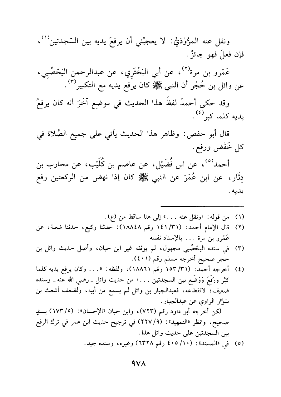 (¬٤) أخرجه أحمد: (٣١/ ١٥٣ رقم ١٨٨٦١)، ولفظه: " ... وكان يرفع يديه كلما كبَّر ورَفَعَ وَوَضَع بين السجدتين ... " من حديث وائل -رضي الله عنه- وسنده ضعيف، لانقطاعه، فعبد الجبار بن وائل لم يسمع من أبيه، ولضعف أشعث بن سَوَّار الراوي عن عبد الجبار.