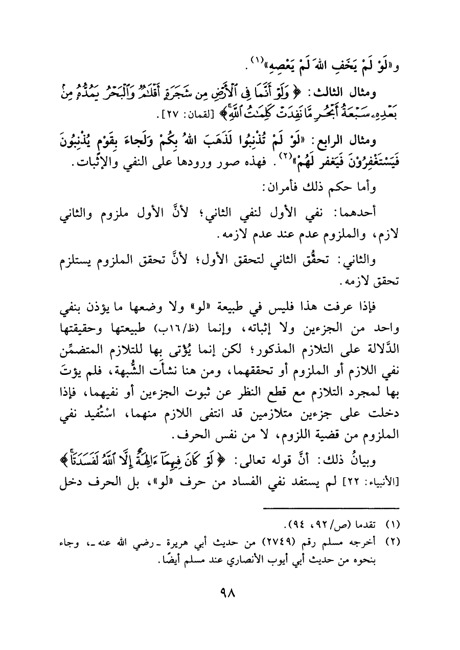 فإذا عرفت هذا فليس في طبيعة "لو" ولا وضعها ما يؤذن بنفي واحد من الجزءين ولا إثباته، وإنما طبيعتها وحقيقتها الدَّلالة على التلازم المذكور؛ لكن إنما يُؤتى بها للتلازم المتضمن نفي اللازم أو الملزوم أو تحققهما, ومن هنا نشأَت الشُّبهة، فلم يؤتَ بها لمجرد التلازم مع قطع النظر عن ثبوت الجزءين أو نفيهما، فإذا دخلت على جزءين متلازمين قد انتفى اللازم منهما، اسْتُفيد نفي الملزوم من قضية اللزوم، لا من نفس الحرف.