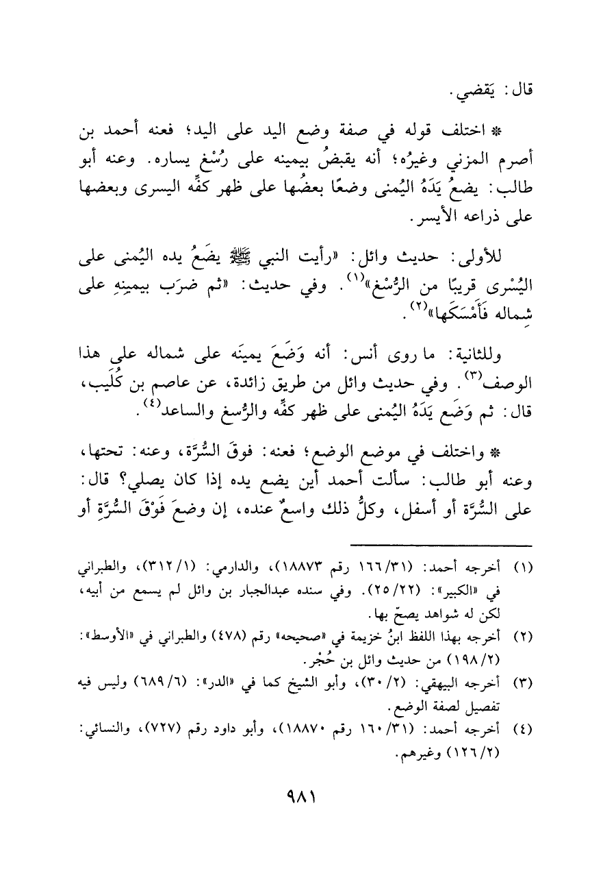 * أختلف قوله في صفة وضع اليد على اليد؛ فعنه أحمد بن أصرم المزني وغيرُه؛ أنه يقبضُ بيمينه على رُسْغ يساره. وعنه أبو طالب: يضعُ يَدَهُ اليُمنى وضعًا بعضُها على ظهر كفِّه اليسرى وبعضها على ذراعه الأيسر.