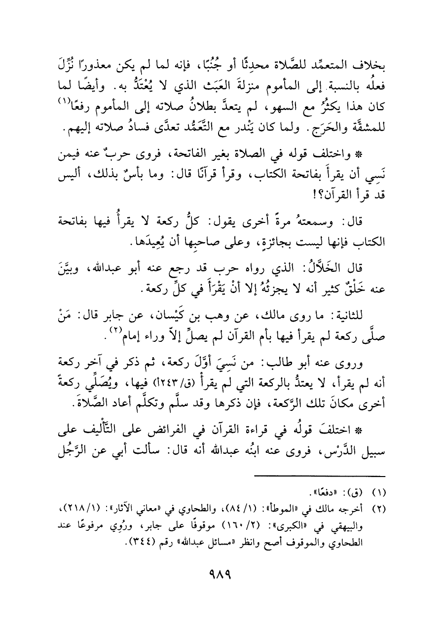 * واختلف قوله في الصلاة بغير الفاتحة، فروى حربٌ عنه فيمن نَسِي أن يقرأَ بفاتحة الكتاب، وقرأ قرآنًا قال: وما بأسٌ بذلك، أليس قد قرأ القرآن؟!