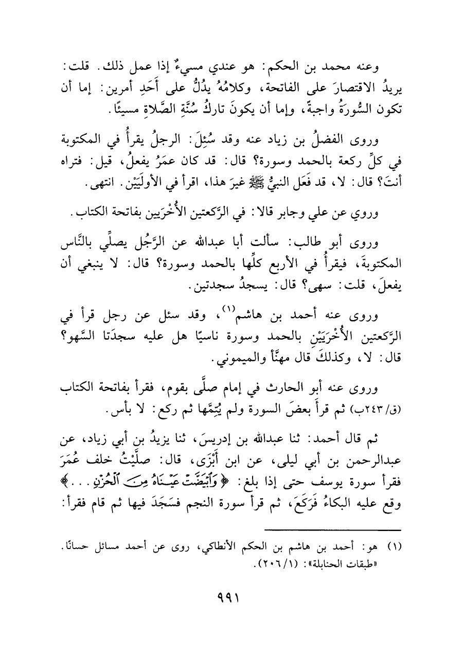 وعنه محمد بن الحكم: هو عندي مسيءٌ إذا عمل ذلك. قلت: يريدُ الاقتصارَ على الفاتحة، وكلامُهُ يدُلُّ على أَحَدِ أمرين: إما أن تكون السُّورَةُ واجبةً، وإما أن يكونَ تاركُ سُنَّةِ الصَّلاةِ مسيئًا.