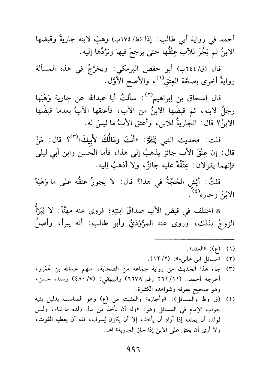 قال إسحاق بن إبراهيم (¬٢): سألتُ أبا عبد الله عن جارية وَهَبَها رجلٌ لابنه، ثم قبضَها الابنُ من الأب، فأعتقها الأبُ بعدما قبضَها الابنُ؟ قال: الجاريةُ للابن، وأعتق الأبُ ما ليسَ له.