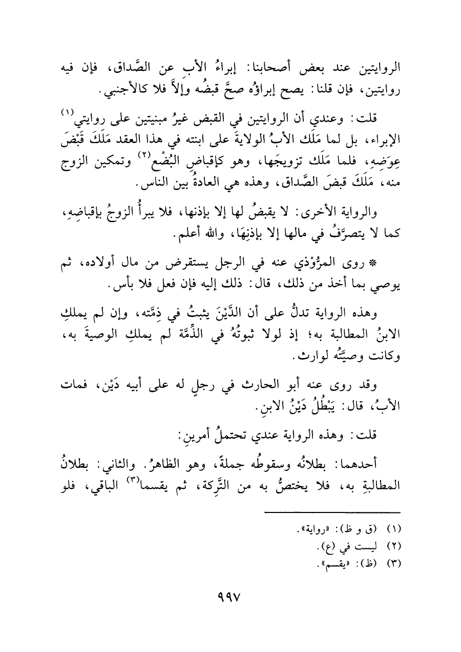 وهذه الرواية تدلُّ على أن الدَّيْنَ يثبتُ في ذِمَّته، وإن لم يملكِ الابنُ المطالبة به؛ إذ لولا ثبوتُهُ في الذِّمَّة لم يملكِ الوصيةَ به، وكانت وصيَّتُه لوارث.