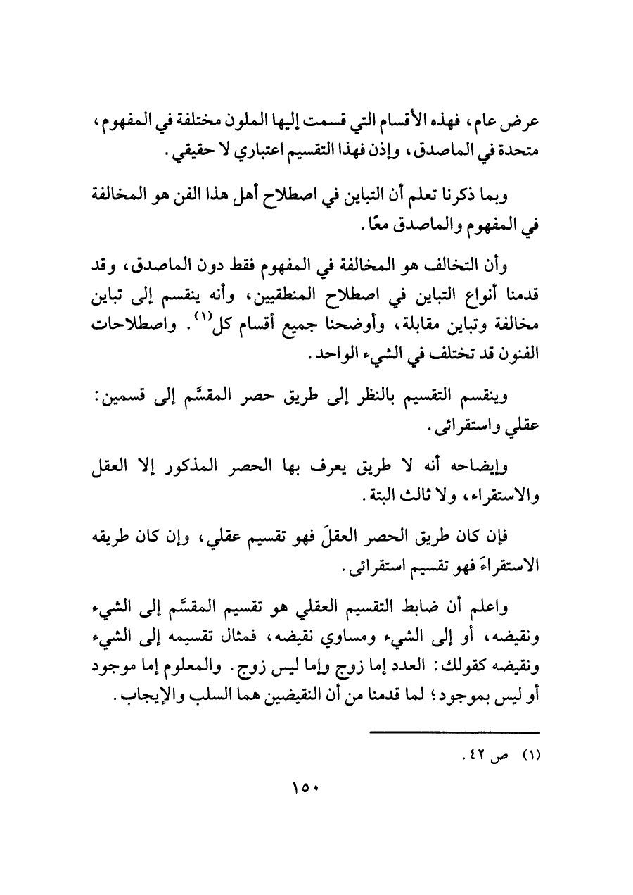 واعلم أن ضابط التقسيم العقلي هو تقسيم المقسَّم إلى الشيء ونقيضه، أو إلى الشيء ومساوي نقيضه، فمثال تقسيمه إلى الشيء ونقيضه كقولك: العدد إما زوج وإما ليس زوج. والمعلوم إما موجود أو ليس بموجود؛ لما قدمنا من أن النقيضين هما السلب والإيجاب.