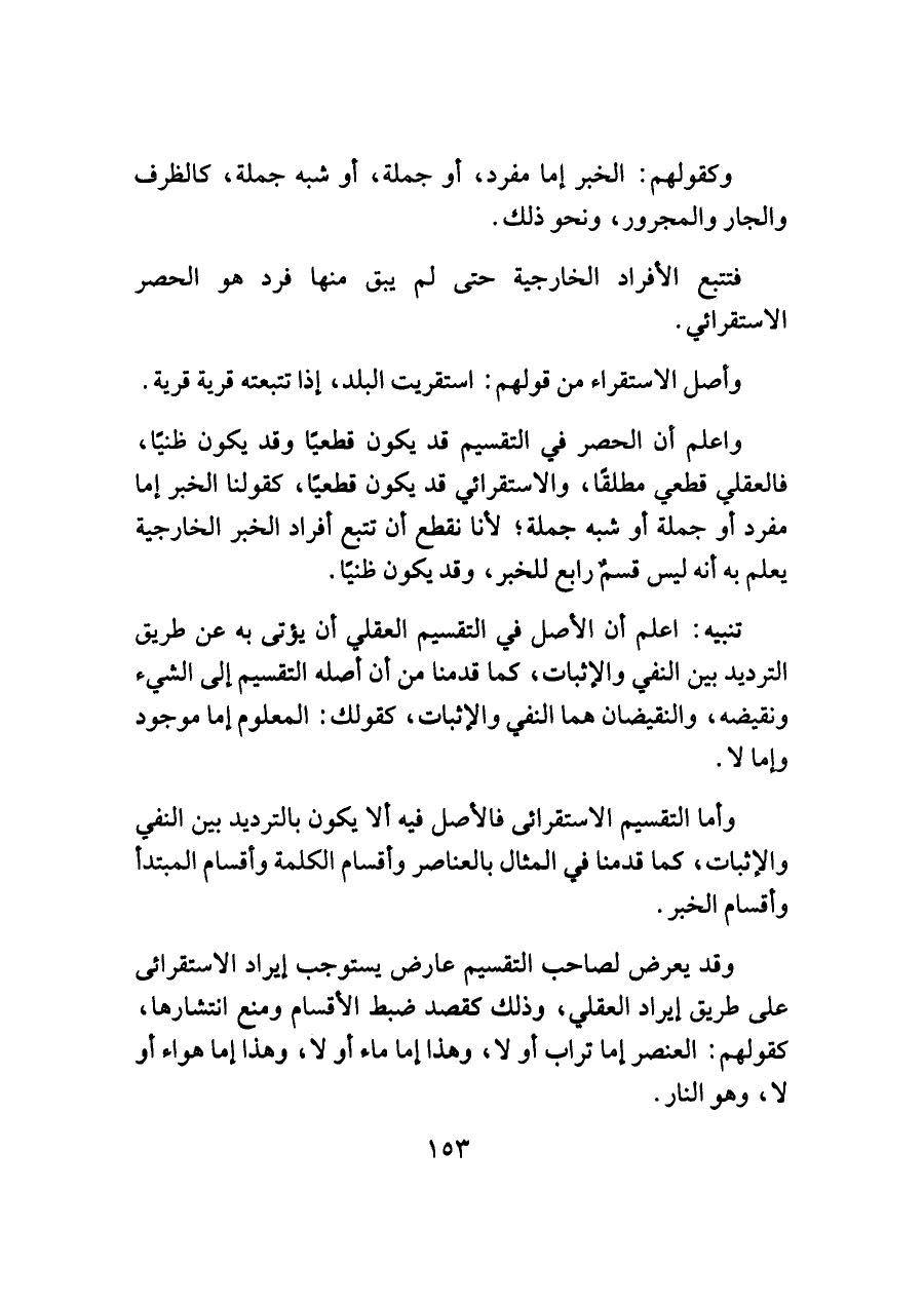 واعلم أن الحصر في التقسيم قد يكون قطعيًّا وقد يكون ظنيًّا، فالعقلي قطعي مطلقًا، والاستقرائي قد يكون قطعيًّا، كقولنا الخبر إما مفرد أو جملة أو شبه جملة؛ لأنا نقطع أن تتبع أفراد الخبر الخارجية يعلم به أنه ليس قسم رابع للخبر، وقد يكون ظنيًّا.