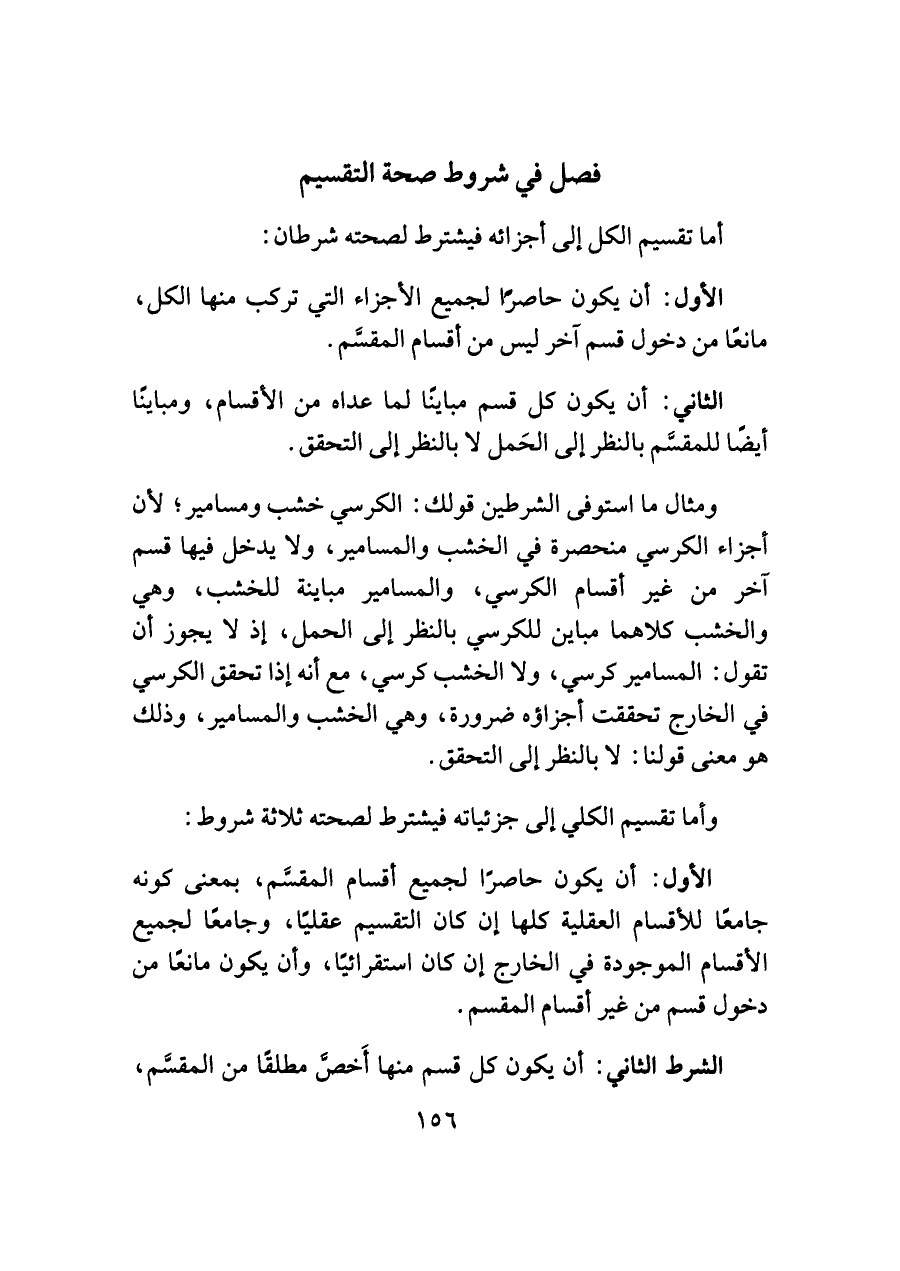 وأما تقسيم الكلي إلى جزئياته فيشترط الصحته ثلاثة شروط: