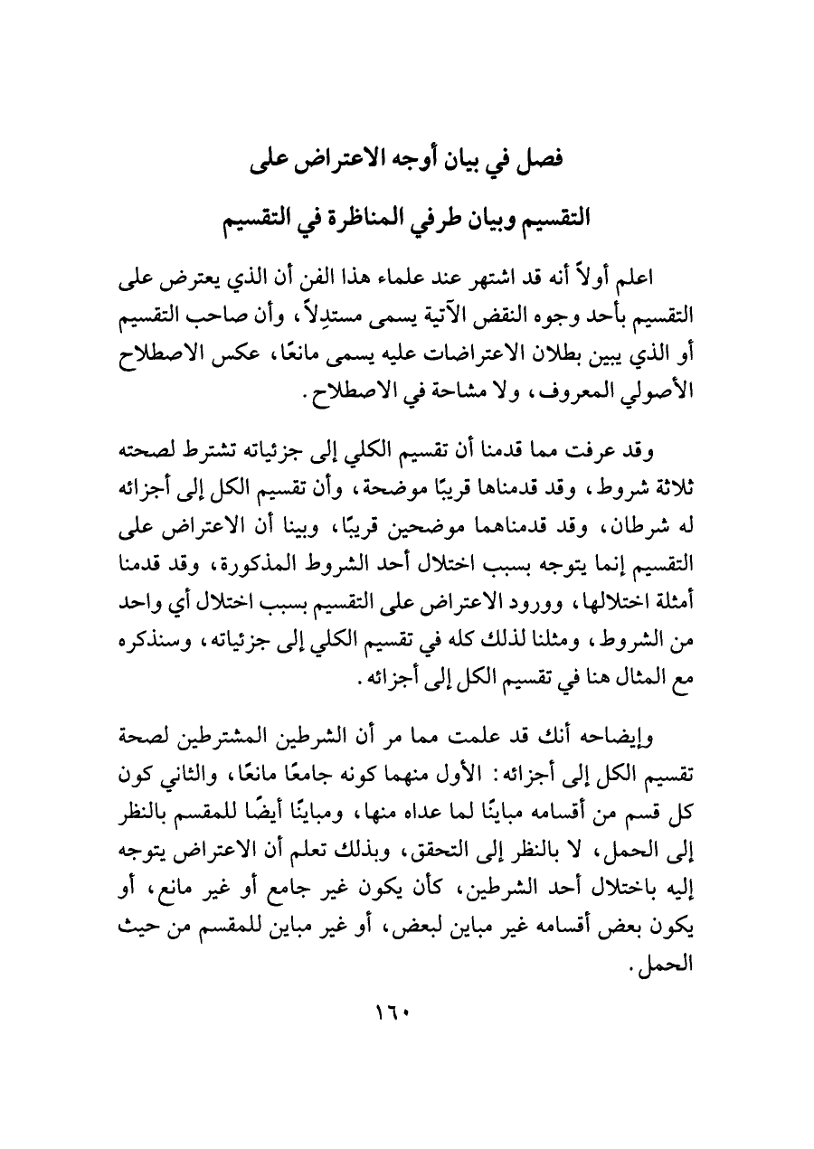 وإيضاحه أنك قد علمت مما مر أن الشرطين المشترطين لصحة تقسيم الكل إلى أجزائه: الأول منهما كونه جامعًا مانعًا، والثاني كون كل قسم من أقسامه مباينًا لما عداه منها، ومباينًا أيضًا للمقسم بالنظر إلى الحمل، لا بالنظر إلى التحقق، وبذلك تعلم أن الاعتراض يتوجه إليه باختلال أحد الشرطين، كان يكون غير جامع أو غير مانع، أو يكون بعض أقسامه غير مباين لبعض، أو غير مباين للمقسم من حيث الحمل.