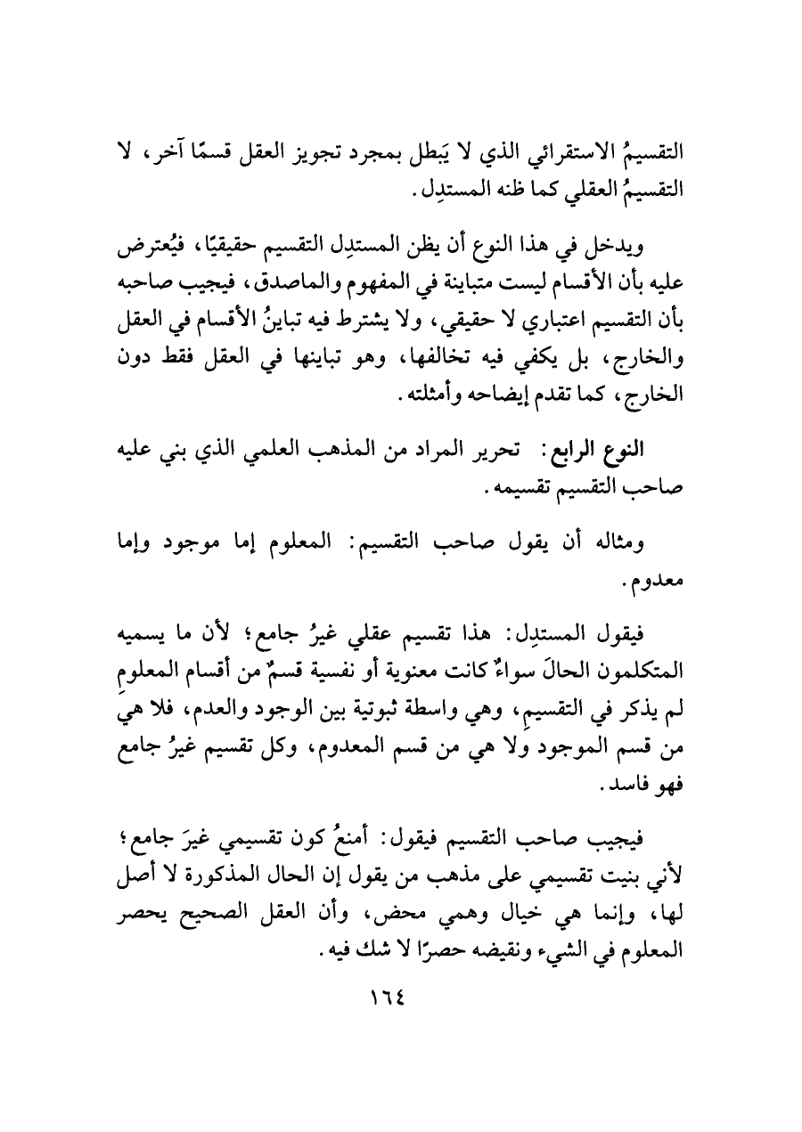 فيجيب صاحب التقسيم فيقول: أمنعُ كون تقسيمي غيرَ جامع؛ لأني بنيت تقسيمي على مذهب من يقول إن الحال المذكورة لا أصل لها، وإنما هي خيال وهمي محض، وأن العقل الصحيح يحصر المعلوم في الشيء ونقيضه حصرًا لا شك فيه.