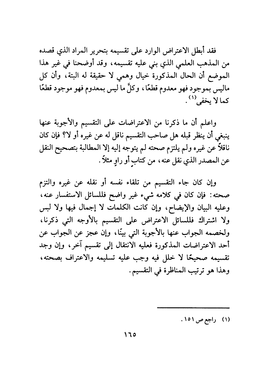 وإن كان جاء التقسيم من تلقاء نفسه أو نقله عن غيره والتزم صحته: فإن كان في كلامه شيء غير واضح فللسائل الاستفسار عنه، وعليه البيان والإيضاح، وإن كانت الكلمات لا إجمال فيها ولا لبس ولا اشتراك فللسائل الاعتراض على التقسيم بالأوجه التي ذكرنا، ولخصمه الجواب عنها بالأجوبة التي بينّا، وإن عجز عن الجواب عن أحد الاعتراضات المذكورة فعليه الانتقال إلى تقسيم آخر، وإن وجد تقسيمه صحيحًا لا خلل فيه وجب عليه تسليمه والاعتراف بصحته، وهذا هو ترتيب المناظرة في التقسيم.