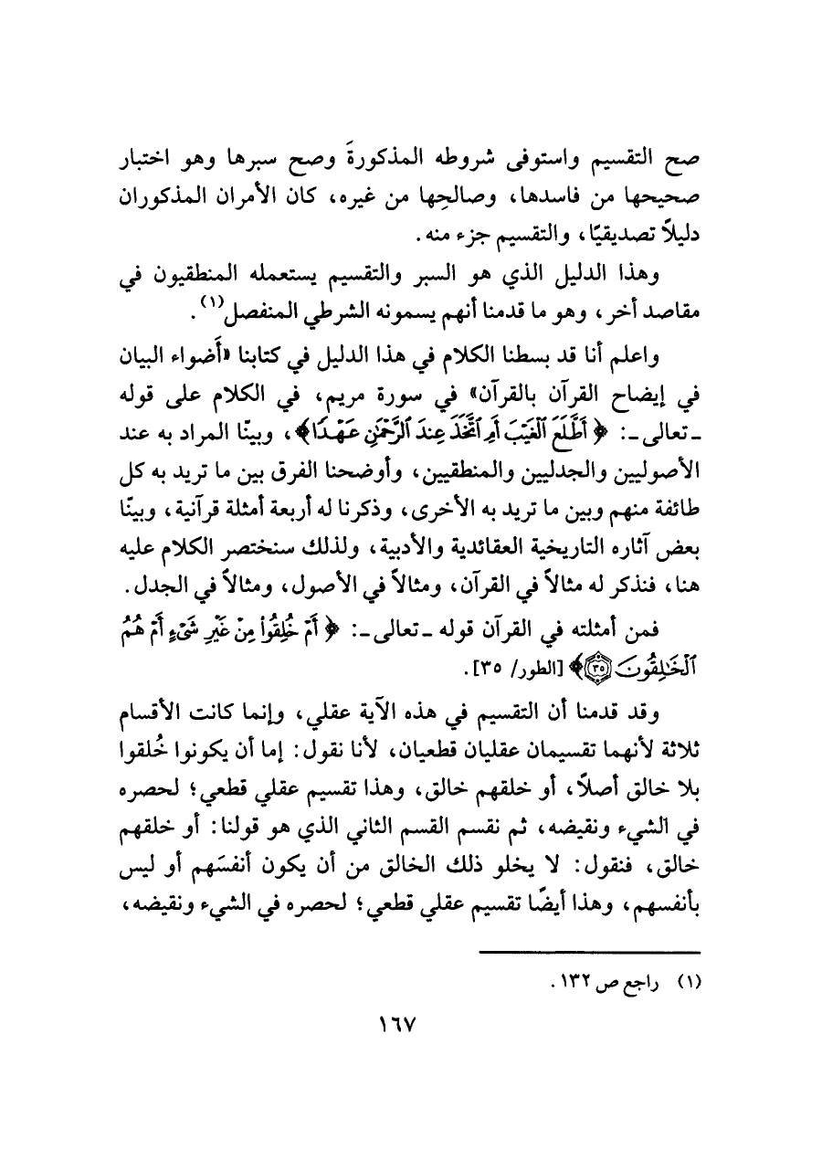 وقد قدمنا أن التقسيم في هذه الآية عقلي، وإنما كانت الأقسام ثلاثة لأنهما تقسيمان عقليان قطعيان، لأنا نقول: إما أن يكونوا خُلقوا بلا خالق أصلًا، أو خلقهم خالق، وهذا تقسيم عقلي قطعي؛ لحصره في الشيء ونقيضه، ثم نقسم القسم الثاني الذي هو قولنا: أو خلقهم خالق، فنقول: لا يخلو ذلك الخالق من أن يكون أنفسَهم أو ليس بأنفسهم، وهذا أيضًا تقسيم عقلي قطعي؛ لحصره في الشيء ونقيضه،