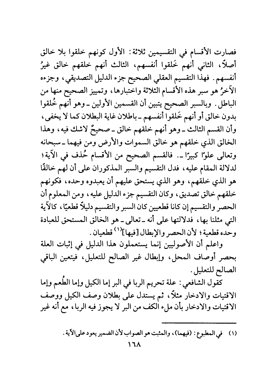 فصارت الأقسام في التقسيمين ثلاثة: الأول كونهم خلقوا بلا خالق أصلًا، الثاني أنهم خَلقوا أنفسهم، الثالث أنهم خلقهم خالق غيرُ أنفسهم. فهذا التقسيم العقلي الصحيح جزء الدليل التصديقي، وجزءه الآخرُ هو سبر هذه الأقسام الثلاثة واختبارها، وتمييز الصحيح منها من الباطل. وبالسبر الصحيح يتبين أن القسمين الأولين -وهو أنهم خُلقوا بدون خالق أو أنهم خَلقوا أنفسهم- باطلان غاية البطلان كما لا يخفى، وأن القسم الثالث -وهو أنهم خلقهم خالق- صحيحٌ لا شك فيه، وهذا الخالق الذي خلقهم هو خالق السموات والأرض ومن فيهما -سبحانه وتعالى علوًا كبيرًا-. فالقسم الصحيح من الأقسام حُذف في الآية؛ لدلالة المقام عليه، فدل التقسيم والسبر المذكوران على أن لهم خالقًا هو الذي خلقهم، وهو الذي يستحق عليهم أن يعبدوه وحده، فكونهم خلقهم خالق تصديق، وكان التقسيم جزء الدليل عليه، ومن المعلوم أن الحصر والتقسيم إن كانا قطعيين كان السبر والتقسيم دليلًا قطعيًّا، كالآية التي مثلنا بها، فدلالتها على أنه -تعالى- هو الخالق المستحق للعبادة وحده قطعية؛ لأن الحصر والإبطال [فيها] (¬١) قطعيان.
