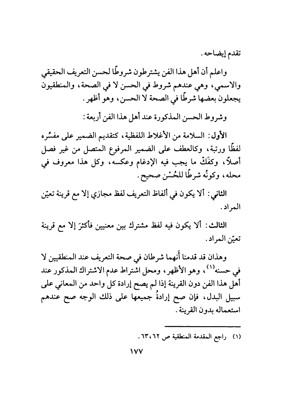 واعلم أن أهل هذا الفن يشترطون شروطًا لحسن التعريف الحقيقي والاسمي، وهي عندهم شروط في الحسن لا في الصحة، والمنطقيون يجعلون بعضها شرطًا في الصحة لا الحسن، وهو أظهر.