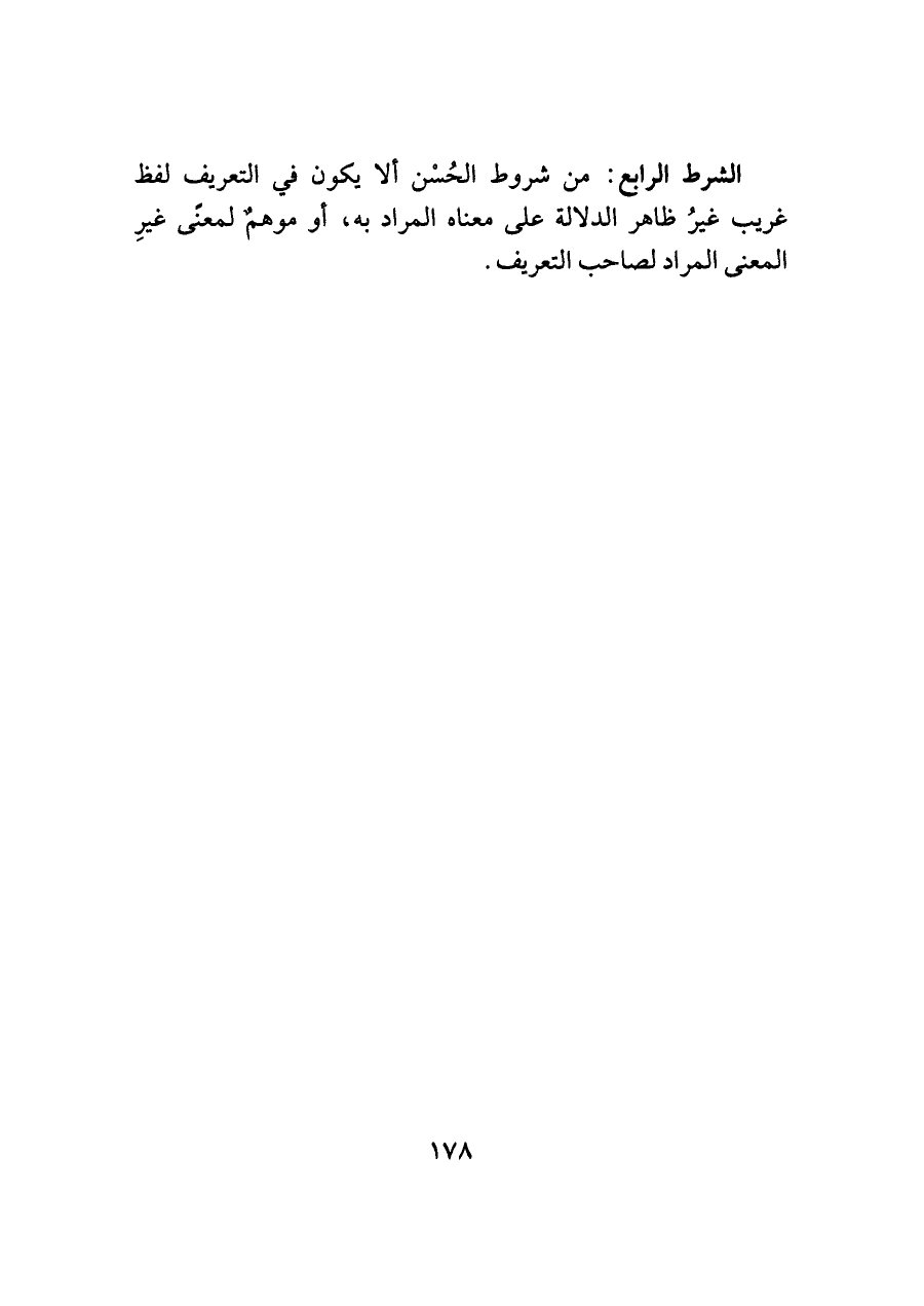الشرط الرابع: من شروط الحُسْن ألا يكون في التعريف لفظ غريب غيرُ ظاهر الدلالة على معناه المراد به، أو موهمٌ لمعنًى غيرِ المعنى المراد لصاحب التعريف.