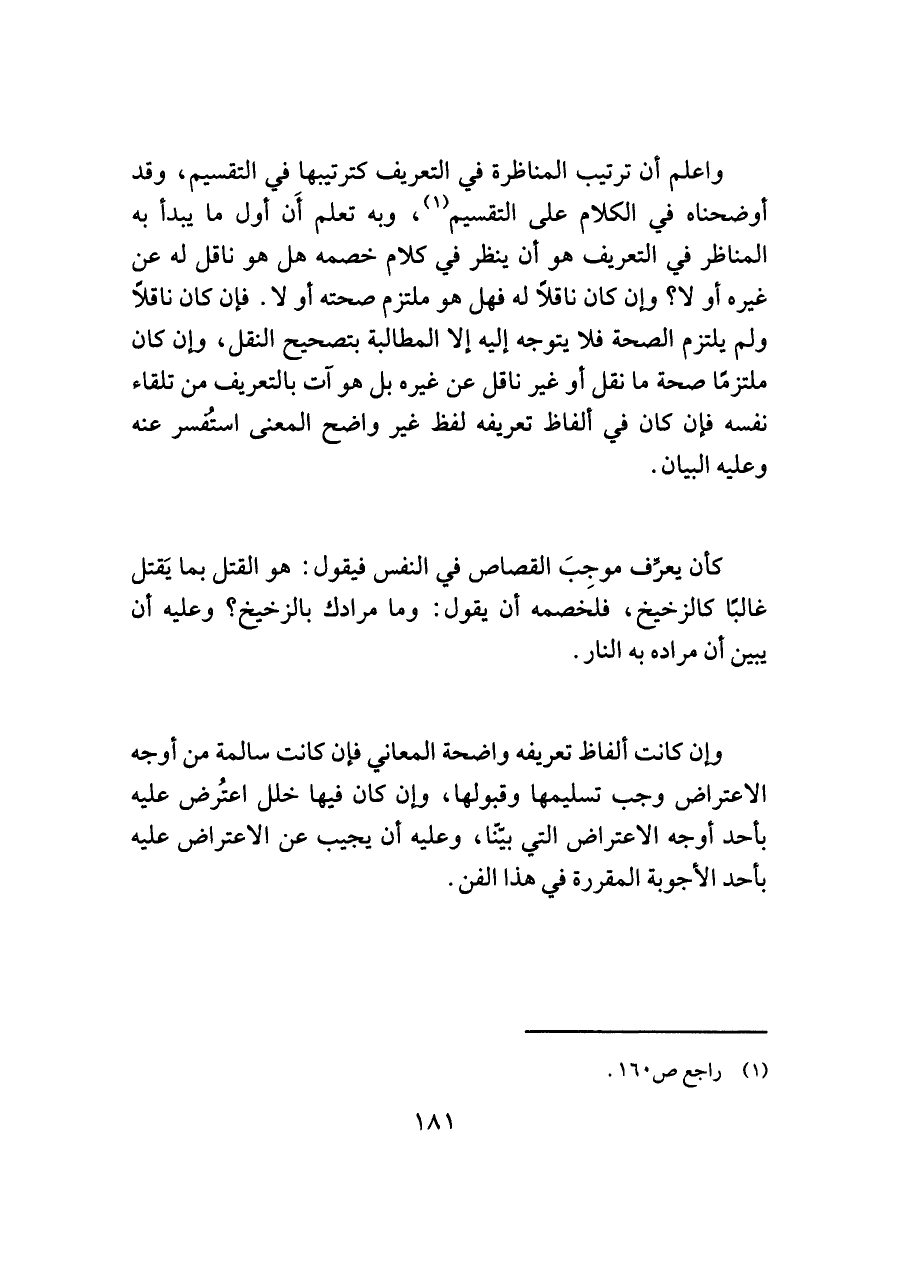 واعلم أن ترتيب المناظرة في التعريف كترتيبها في التقسيم، وقد أوضحناه في الكلام على التقسيم (¬١)، وبه تعلم أَن أول ما يبدأ به المناظر في التعريف هو أن ينظر في كلام خصمه هل هو ناقل له عن غيره أو لا؟ وإن كان ناقلًا له فهل هو ملتزم صحته أو لا. فإن كان ناقلًا ولم يلتزم الصحة فلا يتوجه إليه إلا المطالبة بتصحيح النقل، وإن كان ملتزمًا صحة ما نقل أو غير ناقل عن غيره بل هو آت بالتعريف من تلقاء نفسه فإن كان في ألفاظ تعريفه لفظ غير واضح المعنى استُفسر عنه وعليه البيان.