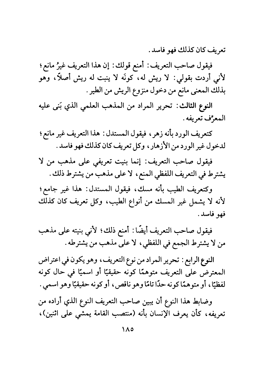 النوع الرابع: تحرير المراد من نوع التعريف، وهو يكون في اعتراض المعترض على التعريف متوهمًا كونه حقيقيًّا أو اسميًّا في حال كونه لفظيًّا، أو متوهمًا كونه حدًّا تامًّا وهو ناقص، أو كونه حقيقيًّا وهو اسمي.