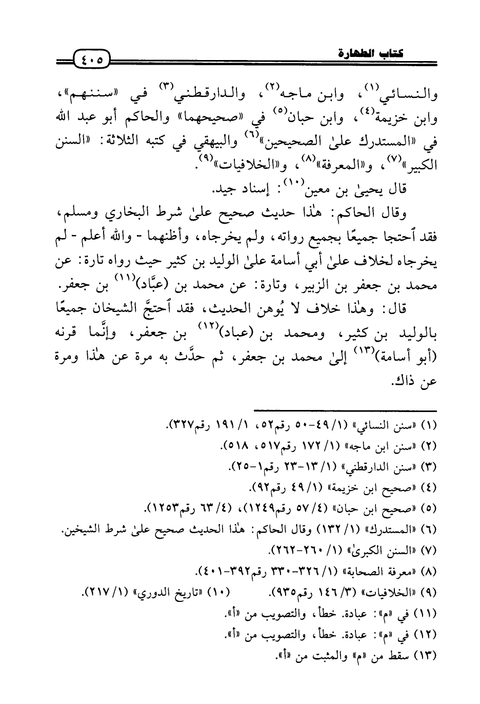 وَقَالَ الْحَاكِم: هَذَا حَدِيث صَحِيح عَلَى شَرط البُخَارِيّ وَمُسلم، فقد احتجا جَمِيعًا بِجَمِيعِ رُوَاته، وَلم يخرجَاهُ، وأظنهما - وَالله أعلم - لم يخرجَاهُ لخلاف عَلَى أبي أُسَامَة عَلَى الْوَلِيد بن كثير حَيْثُ رَوَاهُ تَارَة: عَن مُحَمَّد بن جَعْفَر بن الزبير، وَتارَة: عَن مُحَمَّد بن (عبَّاد) بن جَعْفَر.