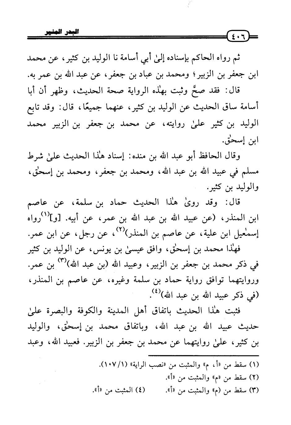 قَالَ: فقد صحَّ وَثَبت بِهَذِهِ الرِّوَايَة صِحَة الحَدِيث، وَظهر أَن أَبَا أُسَامَة سَاق الحَدِيث عَن الْوَلِيد بن كثير، عَنْهُمَا جَمِيعًا، قَالَ: وَقد تَابع الْوَلِيد بن كثير عَلَى رِوَايَته، عَن مُحَمَّد بن جَعْفَر بن الزبير مُحَمَّد بن إِسْحَاق.