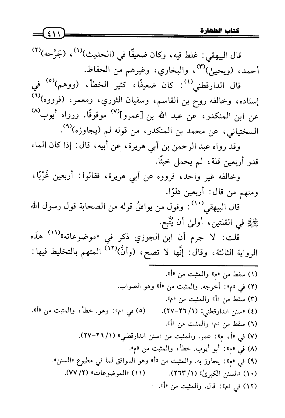 قَالَ الْبَيْهَقِيّ: وَقَول من يوافقُ قَوْله من الصَّحَابَة قَول رَسُول الله - صَلَّى الله عَلَيْهِ وَسلم - فِي الْقلَّتَيْنِ، أولَى أَن يُتَّبع.