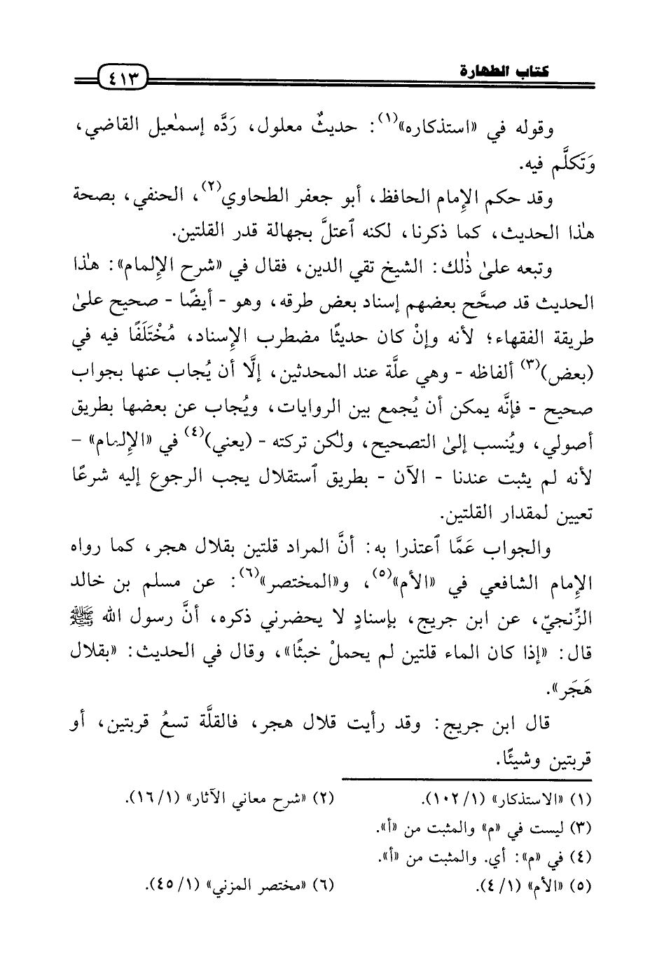 وَقد حكم الإِمام الْحَافِظ، أَبُو جَعْفَر الطَّحَاوِيّ، الْحَنَفِيّ، بِصِحَّة هَذَا الحَدِيث، كَمَا ذكرنَا، لكنه اعتلَّ بِجَهَالَة قدر الْقلَّتَيْنِ.