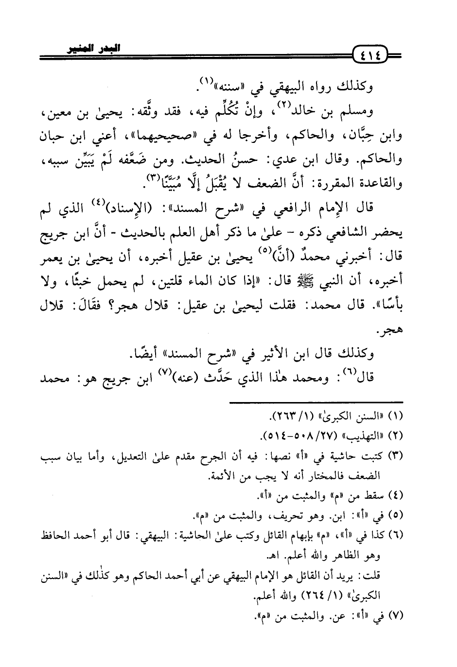 قَالَ الإِمام الرَّافِعِيّ فِي «شرح الْمسند» : (الإِسناد) الَّذِي لم يحضر الشَّافِعِي ذكره - عَلَى مَا ذكر أهل الْعلم بِالْحَدِيثِ - أنَّ ابْن جريج قَالَ: أَخْبرنِي محمدٌ (أنَّ) يَحْيَى بن عقيل أخبرهُ، أَن يَحْيَى بن يعمر أخبرهُ، أَن النَّبِي - صَلَّى الله عَلَيْهِ وَسلم - قَالَ: «إِذا كَانَ المَاء قُلَّتَيْنِ، لم يحمل خبثًا، وَلَا بَأْسا» . قَالَ مُحَمَّد: فَقلت ليحيى بن عقيل: قلال هجر؟ فقَالَ: قلال هجر.