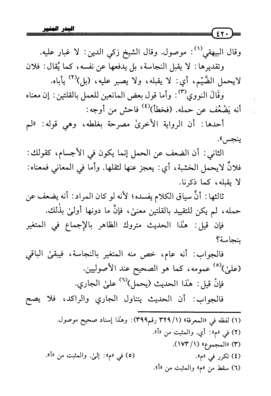 وقَالَ النَّوَوِيّ: وَأما قَول بعض المانعين للْعَمَل بالقلتين: إِن مَعْنَاهُ أَنه يَضْعُف عَن حمله. (فخطأ) فَاحش من أوجه: