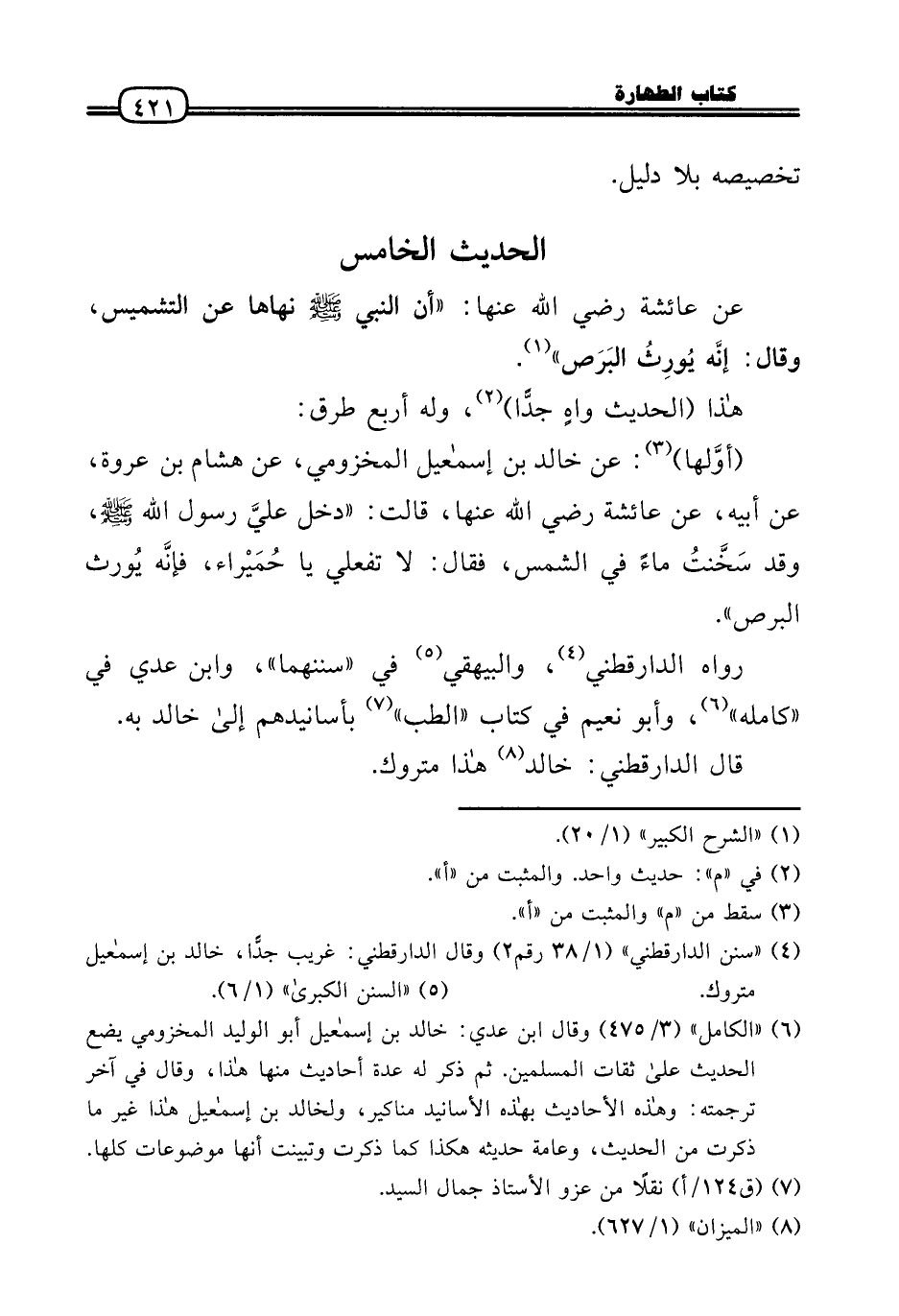 (أوَّلها) : عَن خَالِد بن إِسْمَاعِيل المَخْزُومِي، عَن هِشَام بن عُرْوَة، عَن أَبِيه، عَن عَائِشَة رَضِيَ اللَّهُ عَنْها، قَالَت: «دخل عليَّ رَسُول الله - صَلَّى الله عَلَيْهِ وَسلم -، وَقد سَخَّنتُ مَاء فِي الشَّمْس، فَقَالَ: لَا تفعلي يَا حُمَيْراء، فإنَّه يُورث البرص» .