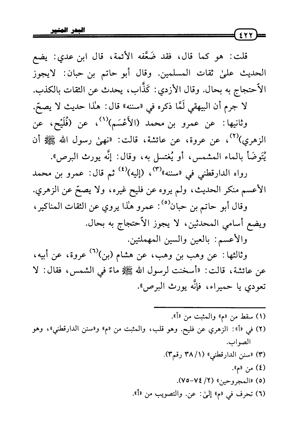 وَثَانِيها: عَن عَمْرو بن مُحَمَّد (الأَعْسَم) ، عَن (فُلَيْح، عَن الزُّهْرِيّ) ، عَن عُرْوَة، عَن عَائِشَة، قَالَت: «نهَى رَسُول الله - صَلَّى الله عَلَيْهِ وَسلم - أَن يُتَوضَأ بِالْمَاءِ المشمس، أَو يُغتسل بِهِ، وَقَالَ: إنَّه يُورث البرص» .
