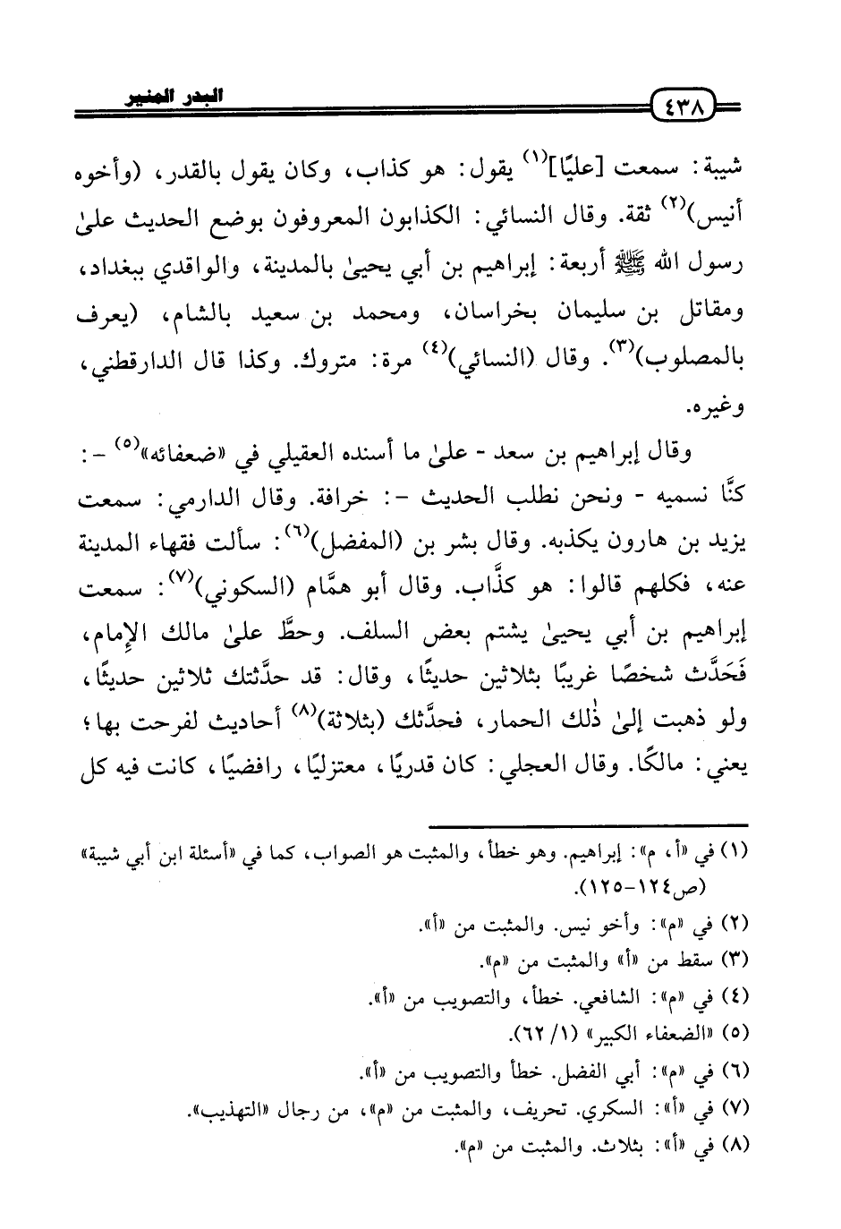 وَقَالَ إِبْرَاهِيم بن سعد - عَلَى مَا أسْندهُ الْعقيلِيّ فِي «ضُعَفَائِهِ» -: كنَّا نُسَمِّيه - وَنحن نطلب الحَدِيث -: خرافة. وَقَالَ الدَّارمِيّ: سَمِعت يزِيد بن هَارُون يكذبهُ. وَقَالَ بشر بن (الْمفضل) : سَأَلت فُقَهَاء الْمَدِينَة عَنهُ، فكلهم قَالُوا: هُوَ كذَّاب. وَقَالَ أَبُو همَّام (السكونِي) : سَمِعت إِبْرَاهِيم بن أبي يَحْيَى يشْتم بعض السّلف. وحطَّ عَلَى مَالك الإِمام، فَحَدَّث شخصا غَرِيبا بِثَلَاثِينَ حَدِيثا، وَقَالَ: قد حدَّثتك ثَلَاثِينَ حَدِيثا، وَلَو ذهبت إِلَى ذَلِك الْحمار، فحدَّثك (بِثَلَاثَة) أَحَادِيث لفرحت بهَا؛ يَعْنِي: مَالِكًا. وَقَالَ الْعجلِيّ: كَانَ قدريًا، معتزليًا، رَافِضِيًّا، كَانَت فِيهِ كل