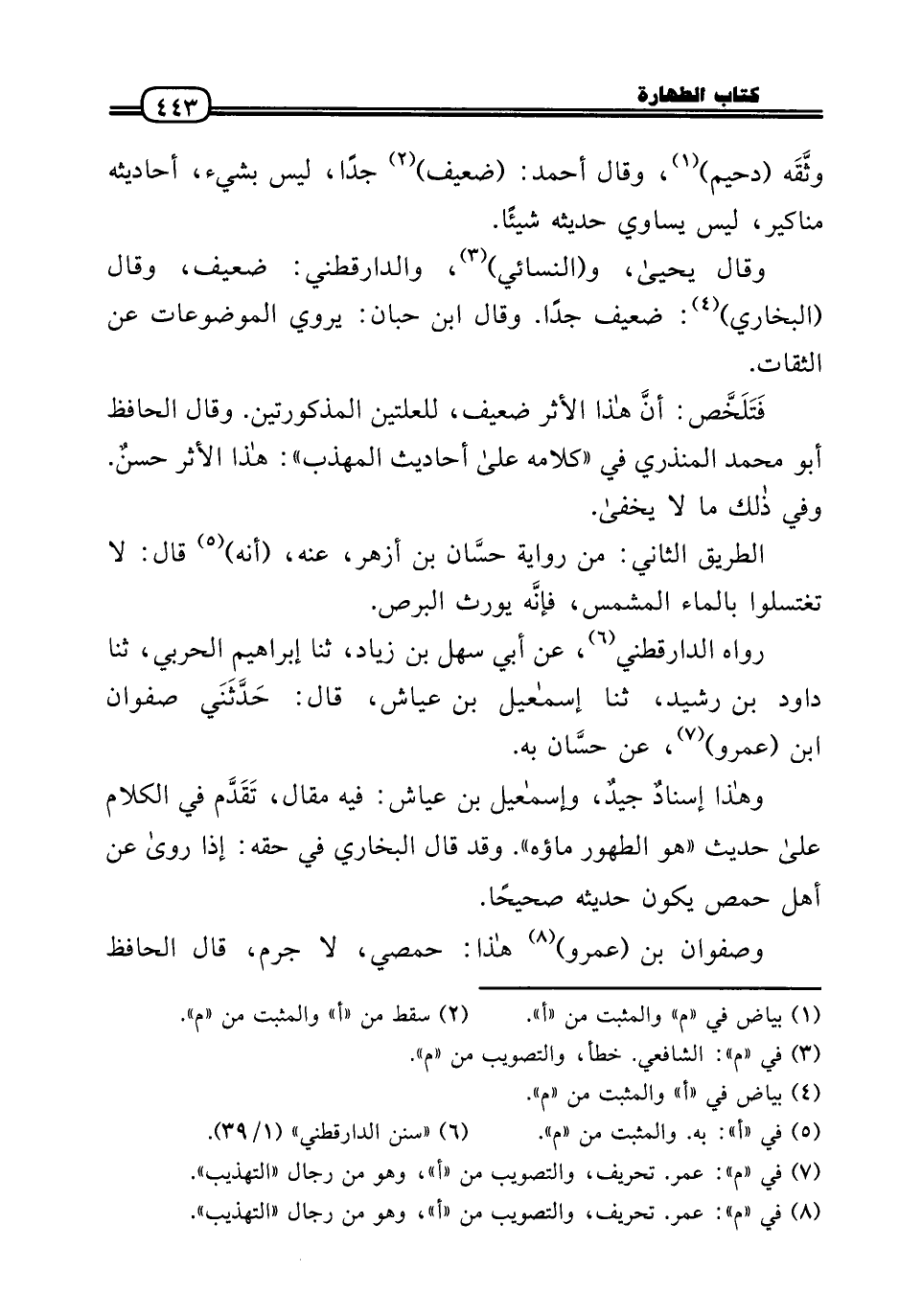 فَتَلَخَّص: أنَّ هَذَا الْأَثر ضَعِيف، للعلتين المذكورتين. وَقَالَ الْحَافِظ أَبُو مُحَمَّد الْمُنْذِرِيّ فِي «كَلَامه عَلَى أَحَادِيث الْمُهَذّب» : هَذَا الْأَثر حسنٌ. وَفِي ذَلِك مَا لَا يخْفَى.