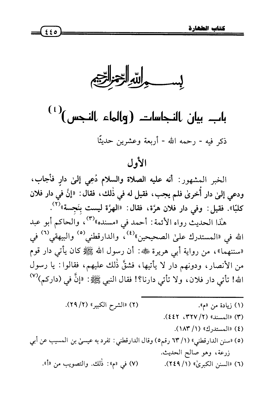 هَذَا الحَدِيث رَوَاهُ الْأَئِمَّة: أَحْمد فِي «مُسْنده» ، وَالْحَاكِم أَبُو عبد الله فِي «الْمُسْتَدْرك عَلَى الصَّحِيحَيْنِ» ، وَالدَّارَقُطْنِيّ وَالْبَيْهَقِيّ فِي «سُنَنهمَا» ، من رِوَايَة أبي هُرَيْرَة رَضِيَ اللَّهُ عَنْه: أَن رَسُول الله - صَلَّى الله عَلَيْهِ وَسلم - كَانَ يَأْتِي دَار قوم من الْأَنْصَار، ودونهم دَار لَا يَأْتِيهَا، فشقَّ ذَلِك عَلَيْهِم، فَقَالُوا: يَا رَسُول الله! تَأتي دَار فلَان، وَلَا تَأتي دَارنَا؟ ! فَقَالَ النَّبِي - صَلَّى الله عَلَيْهِ وَسلم -: «إنَّ فِي (داركم)