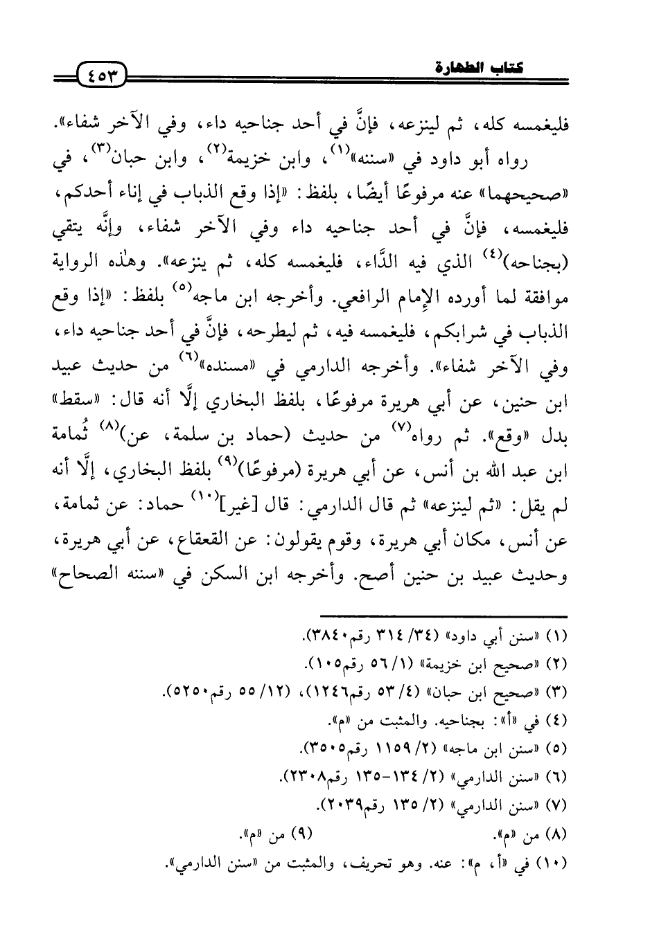 رَوَاهُ أَبُو دَاوُد فِي «سنَنه» ، وَابْن خُزَيْمَة، وَابْن حبَان، فِي «صَحِيحهمَا» عَنهُ مَرْفُوعا أَيْضا، بِلَفْظ: «إِذا وَقع الذُّبَاب فِي إِنَاء أحدكُم، فليغمسه، فإنَّ فِي أحد جناحيه دَاء وَفِي الآخر شِفَاء، وإنَّه يَتَّقِي (بجناحه) الَّذِي فِيهِ الدَّاء، فليغمسه كُله، ثمَّ يَنْزعهُ» . وَهَذِه الرِّوَايَة مُوَافقَة لما أوردهُ الإِمام الرَّافِعِيّ. وَأخرجه ابْن مَاجَه بِلَفْظ: «إِذا وَقع الذُّبَاب فِي شرابكم، فليغمسه فِيهِ، ثمَّ ليطرحه، فإنَّ فِي أحد جناحيه دَاء، وَفِي الآخر شِفَاء» . وَأخرجه الدَّارمِيّ فِي «مُسْنده» من حَدِيث عبيد بن حنين، عَن أبي هُرَيْرَة مَرْفُوعا، بِلَفْظ البُخَارِيّ إلاَّ أَنه قَالَ: «سقط» بدل «وَقع» . ثمَّ رَوَاهُ من حَدِيث (حَمَّاد بن سَلمَة، عَن) ثُمامة بن عبد الله بن أنس، عَن أبي هُرَيْرَة (مَرْفُوعا) بِلَفْظ البُخَارِيّ، إلاَّ أَنه لم يقل: «ثمَّ لينزعه» ثمَّ قَالَ الدَّارمِيّ: قَالَ [غير] حَمَّاد: عَن ثُمَامَة، عَن أنس، مَكَان أبي هُرَيْرَة، وَقوم يَقُولُونَ: عَن الْقَعْقَاع، عَن أبي هُرَيْرَة، وَحَدِيث عبيد بن حنين أصح. وَأخرجه ابْن السكن فِي «سنَنه الصِّحَاح»