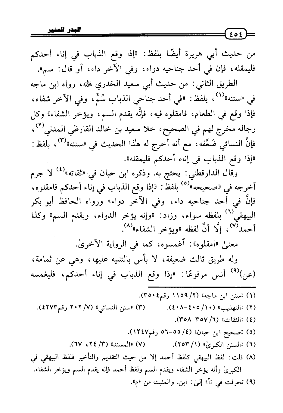 الطَّرِيق الثَّانِي: من حَدِيث أبي سعيد الْخُدْرِيّ رَضِيَ اللَّهُ عَنْه، رَوَاهُ ابْن مَاجَه فِي «سنَنه» ، بِلَفْظ: «فِي أحد جناحي الذُّبَاب سُمٌّ، وَفِي الآخر شِفَاء، فَإِذا وَقع فِي الطَّعَام، فامقلوه فِيهِ، فإنَّه يقدم السم، وَيُؤَخر الشِّفَاء» وكل رِجَاله مخرج لَهُم فِي الصَّحِيح، خلا سعيد بن خَالِد القارظي الْمدنِي، فإنَّ النَّسَائِيّ ضَعَّفه، مَعَ أَنه أخرج لَهُ هَذَا الحَدِيث فِي «سنَنه» ، بِلَفْظ: «إِذا وَقع الذُّبَاب فِي إِنَاء أحدكُم فليمقله» .