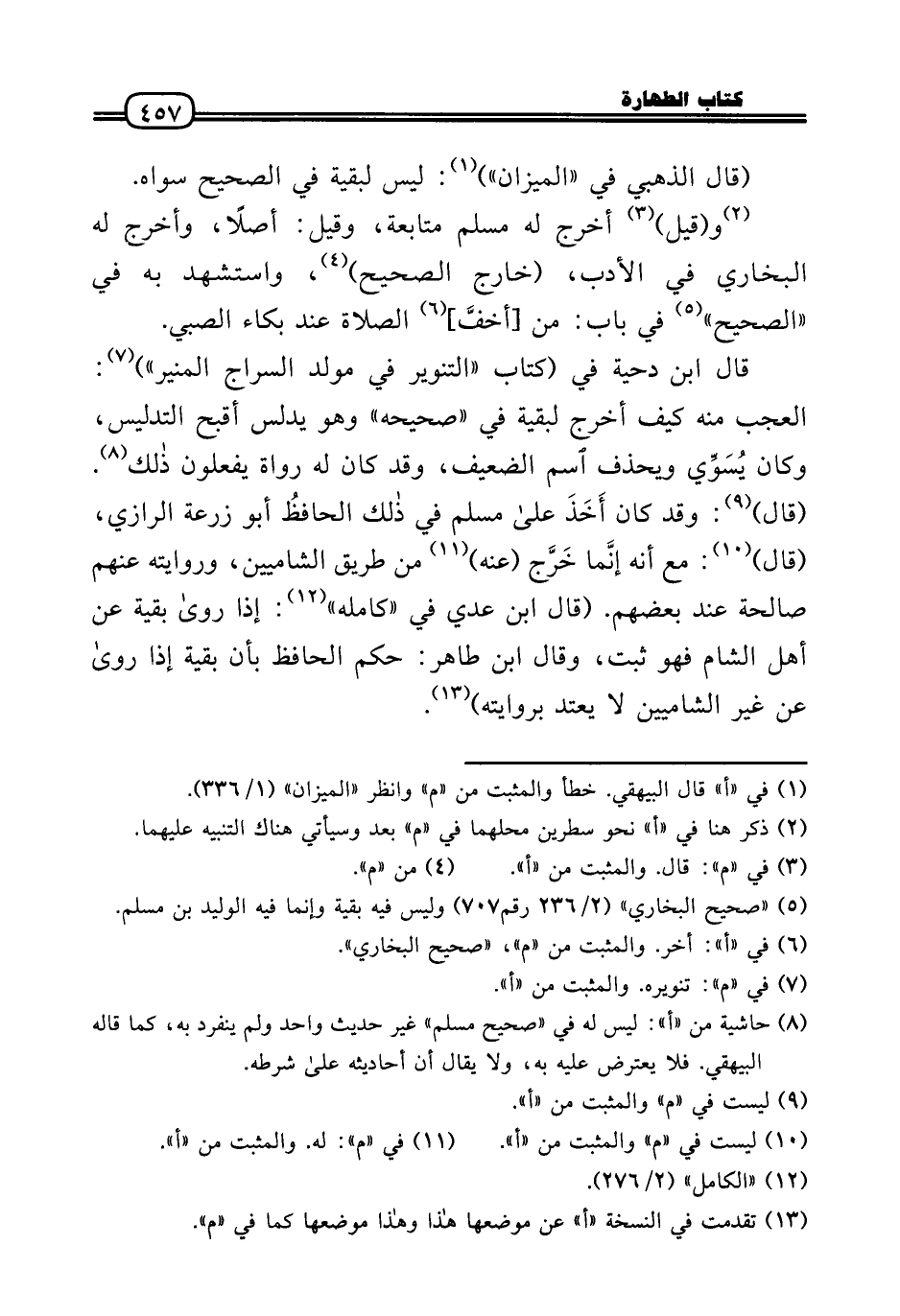 قَالَ ابْن دحْيَة فِي (كتاب «التَّنْوِير فِي مولد السراج الْمُنِير» ) : الْعجب مِنْهُ كَيفَ أخرج لبَقيَّة فِي «صَحِيحه» وَهُوَ يُدَلس أقبح التَّدْلِيس، وَكَانَ يُسَوِّي ويحذف اسْم الضَّعِيف، وَقد كَانَ لَهُ رُوَاة يَفْعَلُونَ ذَلِك. (قَالَ) : وَقد كَانَ أَخَذَ عَلَى مُسلم فِي ذَلِك الحافظُ أَبُو زرْعَة الرَّازِيّ، (قَالَ) : مَعَ أَنه إنَّما خَرَّج (عَنهُ) من طَرِيق الشاميين، وَرِوَايَته عَنْهُم صَالِحَة عِنْد بَعضهم. (قَالَ ابْن عدي فِي «كَامِله» : إِذا رَوَى بَقِيَّة عَن أهل الشَّام فَهُوَ ثَبت، وَقَالَ ابْن طَاهِر: حكم الْحَافِظ بِأَن بَقِيَّة إِذا رَوَى عَن غير الشاميين لَا يعْتد بروايته) .