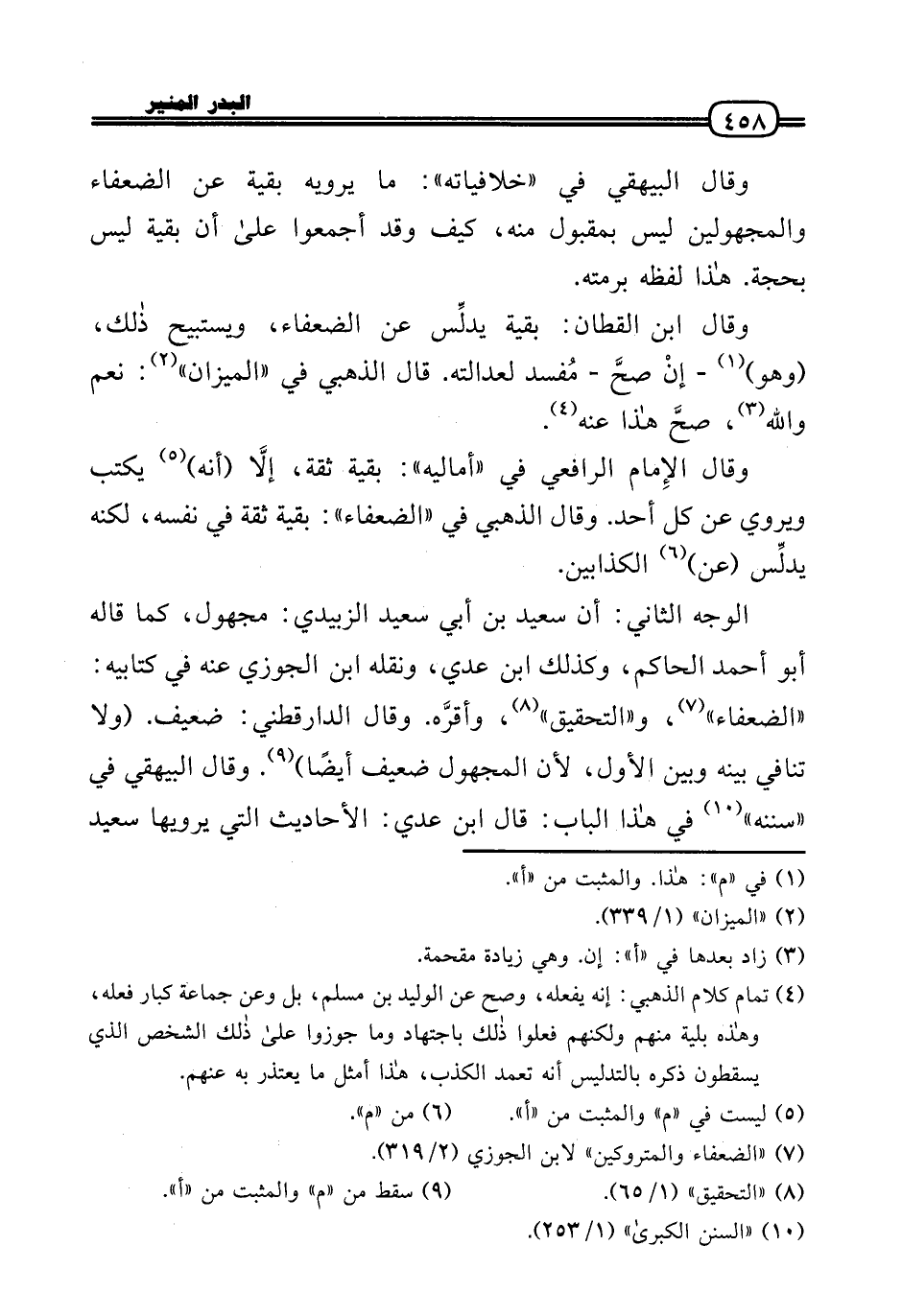 وَقَالَ الْبَيْهَقِيّ فِي «خلافياته» : مَا يرويهِ بَقِيَّة عَن الضُّعَفَاء والمجهولين لَيْسَ بمقبول مِنْهُ، كَيفَ وَقد أَجمعُوا عَلَى أَن بَقِيَّة لَيْسَ بِحجَّة. هَذَا لَفظه برمتِهِ.