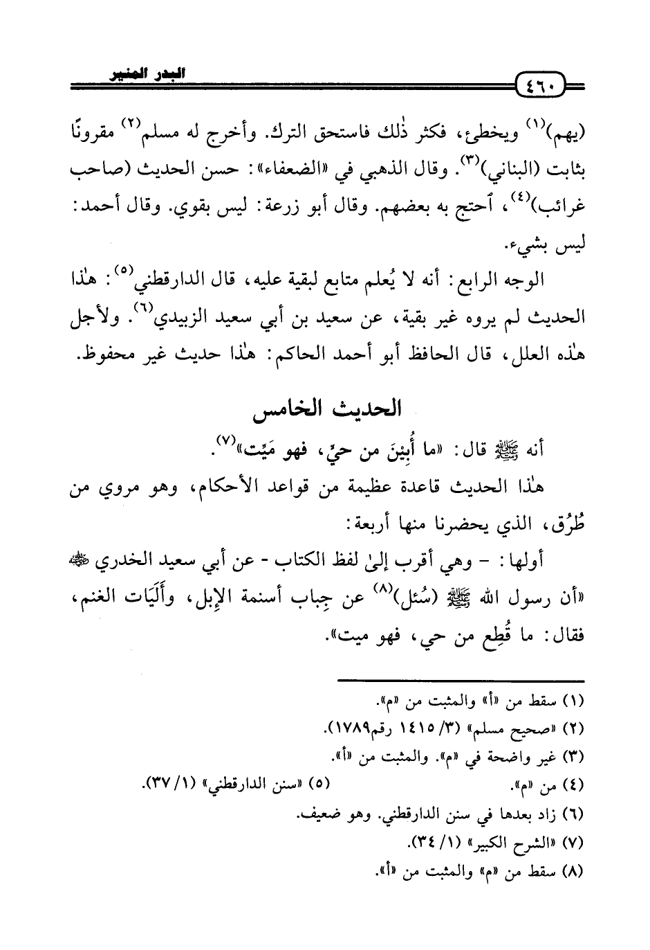أَولهَا: - وَهِي أقرب إِلَى لفظ الْكتاب - عَن أبي سعيد الْخُدْرِيّ رَضِيَ اللَّهُ عَنْه «أَن رَسُول الله - صَلَّى الله عَلَيْهِ وَسلم - (سُئل) عَن جِباب أسنمة الإِبل، وأَلَيَات الْغنم، فَقَالَ: مَا قُطِع من حَيّ، فَهُوَ ميت» .
