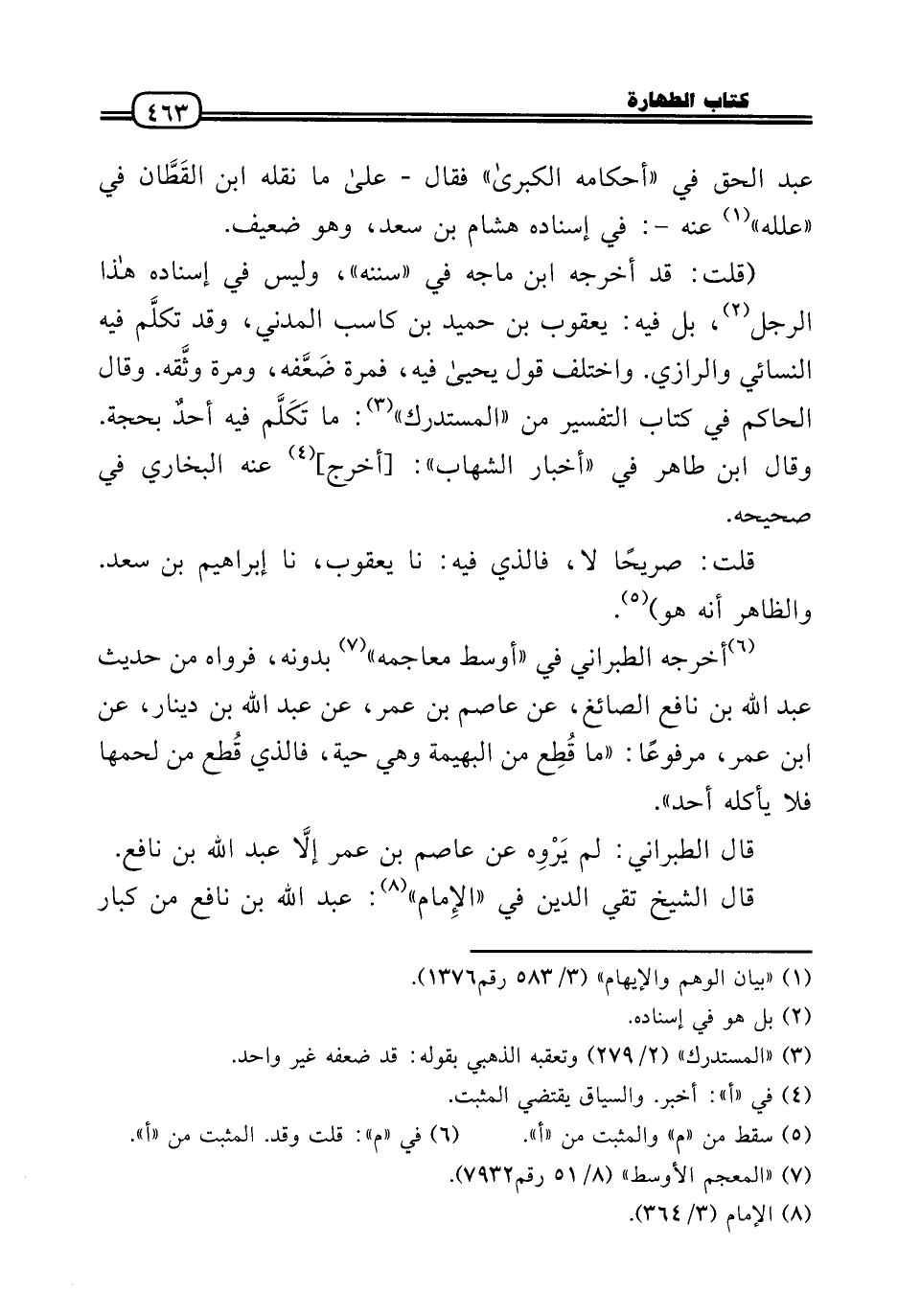 عبد الْحق فِي «أَحْكَامه الْكُبْرَى» فَقَالَ - عَلَى مَا نَقله ابْن القَطَّان فِي «علله» عَنهُ -: فِي إِسْنَاده هِشَام بن سعد، وَهُوَ ضَعِيف.