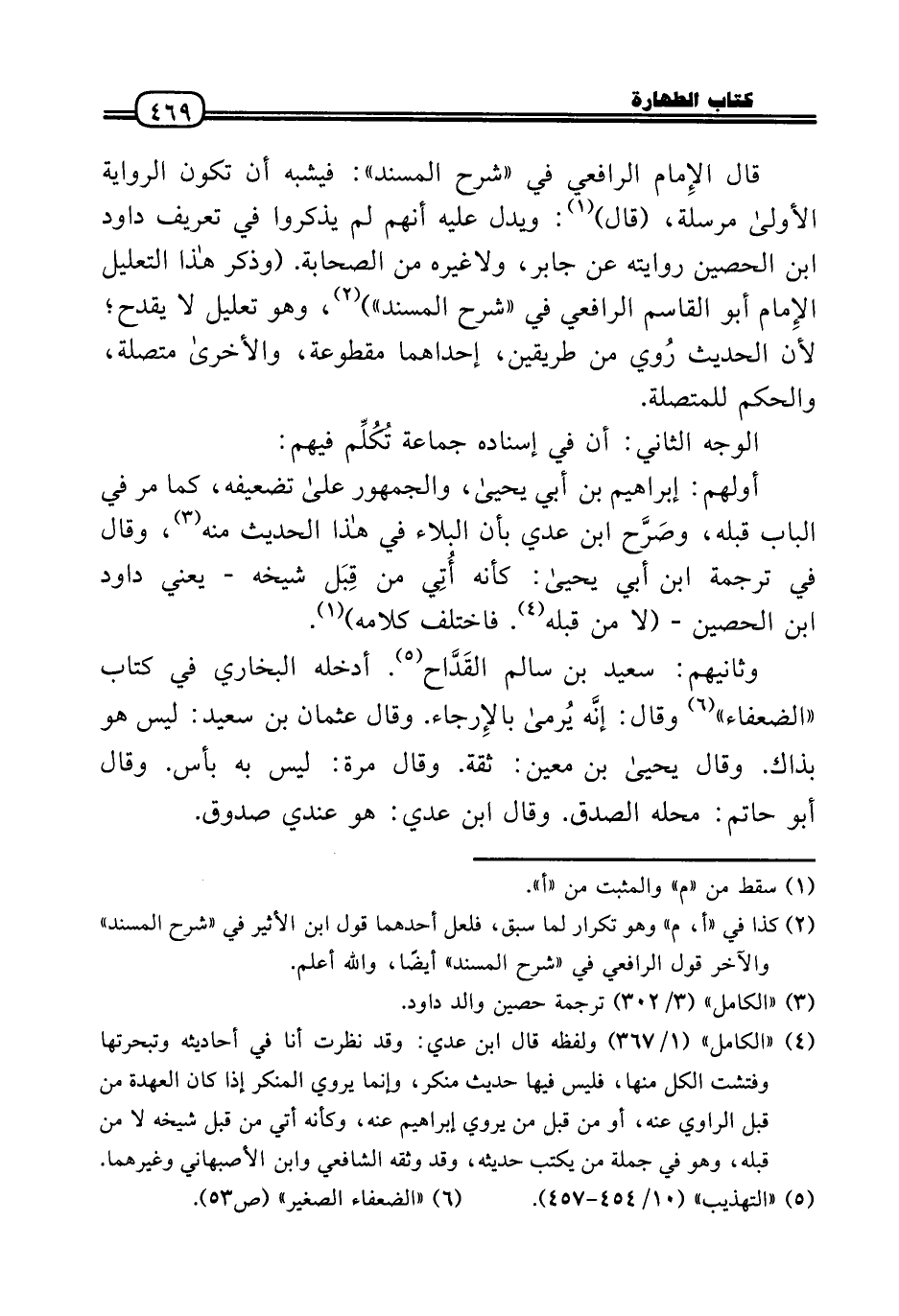 قَالَ الإِمام الرَّافِعِيّ فِي «شرح الْمسند» : فَيُشبه أَن تكون الرِّوَايَة الأولَى مُرْسلَة، (قَالَ) : وَيدل عَلَيْهِ أَنهم لم يذكرُوا فِي تَعْرِيف دَاوُد بن الْحصين رِوَايَته عَن جَابر، ولاغيره من الصَّحَابَة. (وَذكر هَذَا التَّعْلِيل الإِمام أَبُو الْقَاسِم الرَّافِعِيّ فِي «شرح الْمسند» ) ، وَهُوَ تَعْلِيل لَا يقْدَح؛ لِأَن الحَدِيث رُوي من طَرِيقين، إِحْدَاهمَا مَقْطُوعَة، وَالْأُخْرَى مُتَّصِلَة، وَالْحكم للمتصلة.