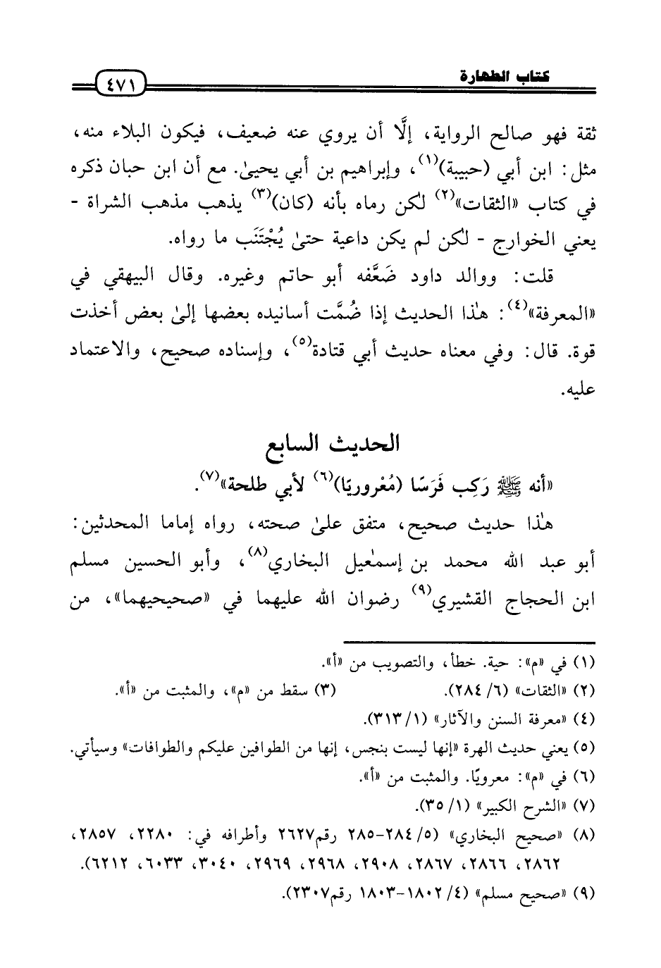 «أَنه - صَلَّى الله عَلَيْهِ وَسلم - رَكِب فَرَسًا (مُعْروريًا) لأبي طَلْحَة» .