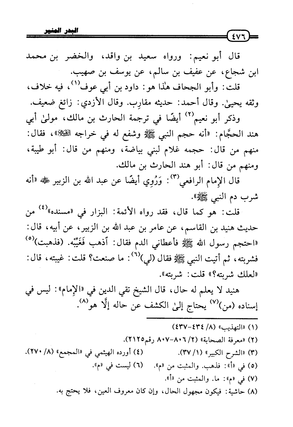 قلت: هُوَ كَمَا قَالَ، فقد رَوَاهُ الْأَئِمَّة: الْبَزَّار فِي «مُسْنده» من حَدِيث هنيد بن الْقَاسِم، عَن عَامر بن عبد الله بن الزبير، عَن أَبِيه، قَالَ: «احْتجم رَسُول الله - صَلَّى الله عَلَيْهِ وَسلم - فَأَعْطَانِي الدَّم فَقَالَ: اذْهَبْ فَغَيِّبْه. (فَذَهَبت) فَشَربته، ثمَّ أتيت النَّبِي - صَلَّى الله عَلَيْهِ وَسلم - فَقَالَ (لي) : مَا صنعت؟ قلت: غيبته، قَالَ: «لَعَلَّك شربته؟» قلت: شربته» .